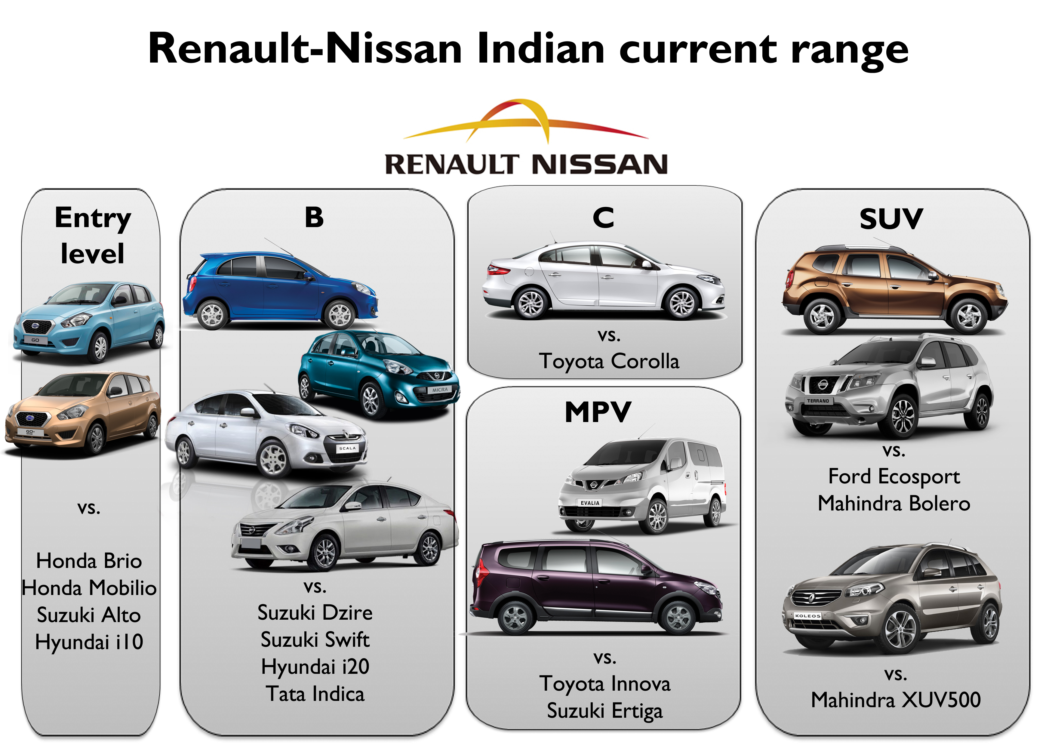 The alliance offers a big range of products, starting with the budget Datsuns (Go and Go+), the subcompacts, minivans and SUVs. The entry-level and B-segment products are direct competitors of other popular cars in India. The latest launch was the Renault Lodgy to compete in the popular small/mid-size minivan segment. In the SUV segment, the group relies on the popular Duster and it enlarged its success by introducing a more refined version using Nissan’s logo: the Terrano. A city-car will join them shortly.