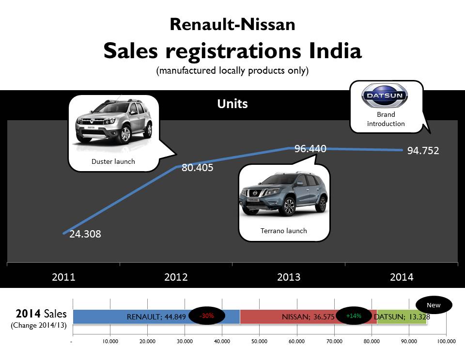 Locally built products have had a very good sales evolution during the last 4 years. The introduction of the Renault Duster in July 2012 and the Nissan Terrano in September 2013 allowed the alliance to reach a sales peak in 2013 of almost 100.000 units. In 2014 they introduced Datsun brand and in less than 11 months there, that budget car brand outsold Fiat. Source: SIAM and Carsitaly.net