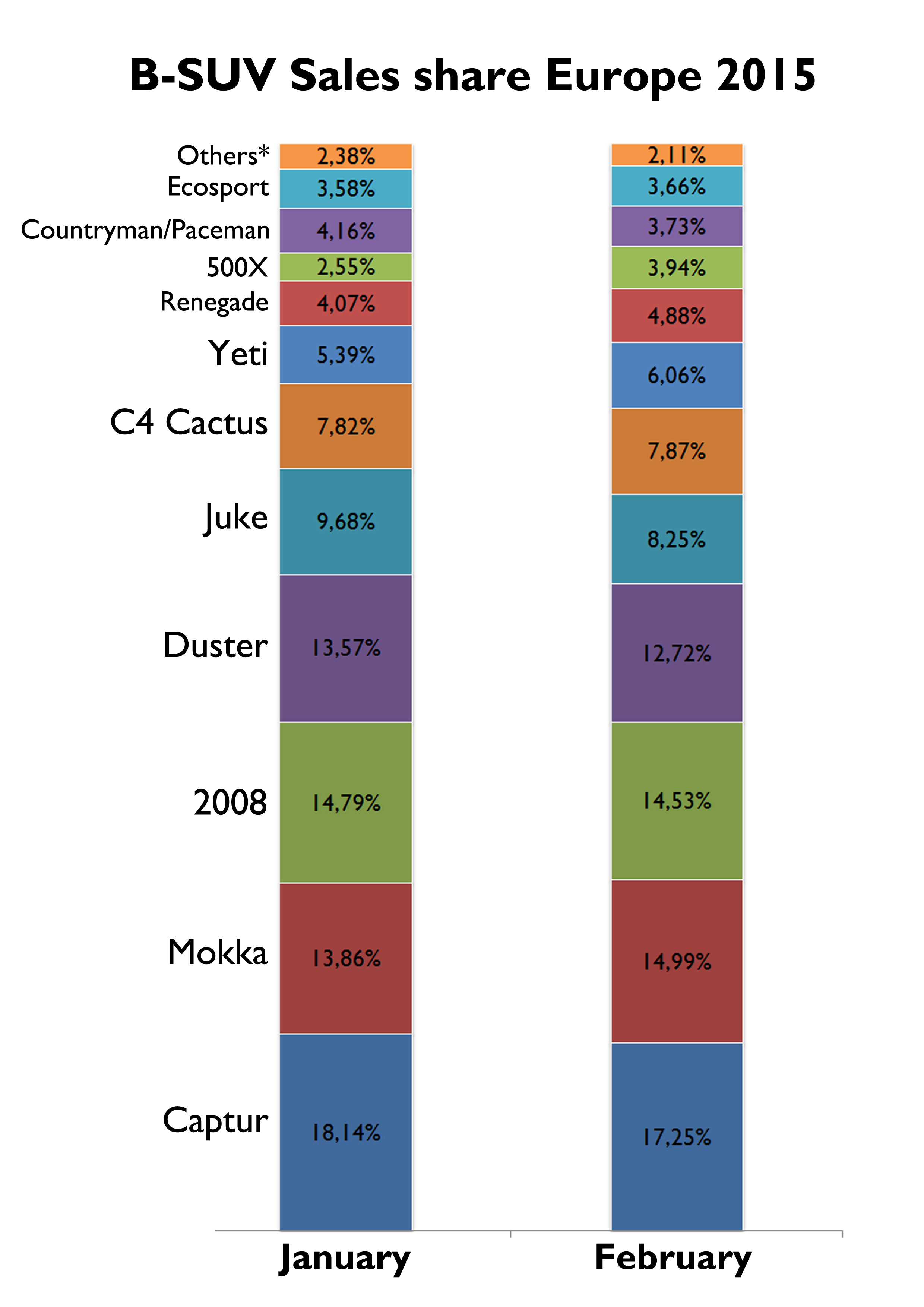European B-SUV sales rose by 41% in February to 80.000 vehicles, according to JATO Dynamics data. The increase resulted from a larger offer and better results for the majority of the nameplates available one year earlier. February registrations benefited from the arrival of the Fiat 500X , Jeep Renegade, Ford Ecosport, Suzuki Vitara and Citroen C4 Cactus, which were not available one year ago. However it wasn’t the only cause of the growth, as the remaining models were able to post a positive growth of 11%. The new comers registrations counted for 21% of the total, while sales for the Opel/Vauxhall Mokka went up a massive 67%, +35% for the Skoda Yeti, and 22% more for the Renault Captur. The Mini Countryman/Paceman was the only small SUV to register a negative growth basically because of the arrival of the Jeep Renegade (in the same price range) and because it is getting old.