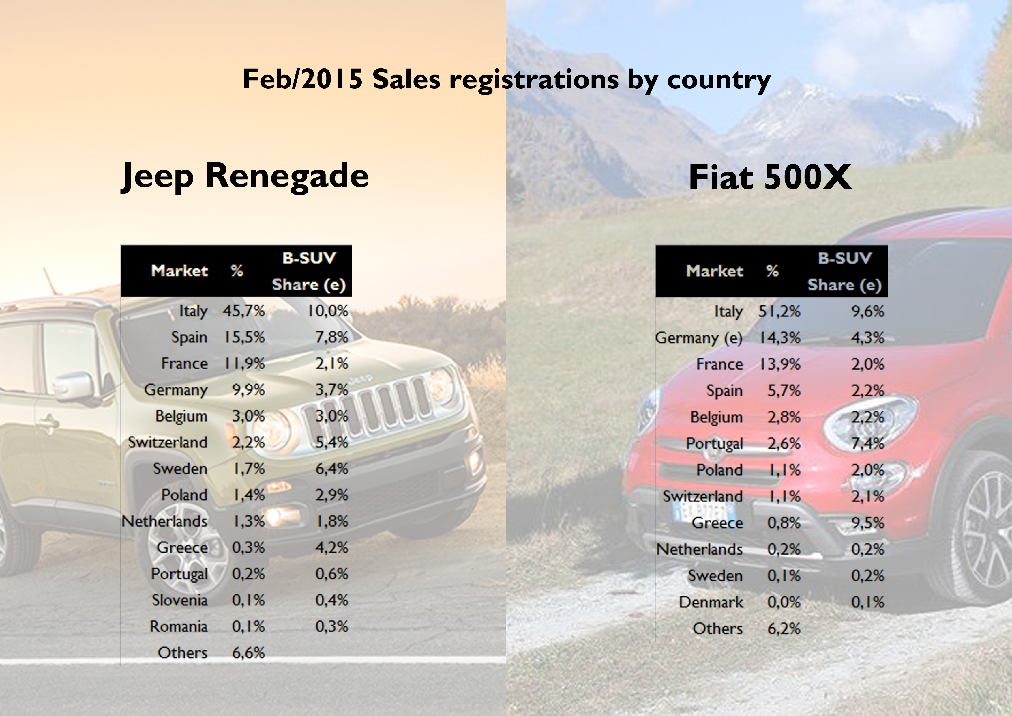Jeep Renegade sales reached a new peak in February thanks to the good results in Italy (46% of total European sales). The Fiat 500X registrations advanced 52% month-on-month. Source: JATO