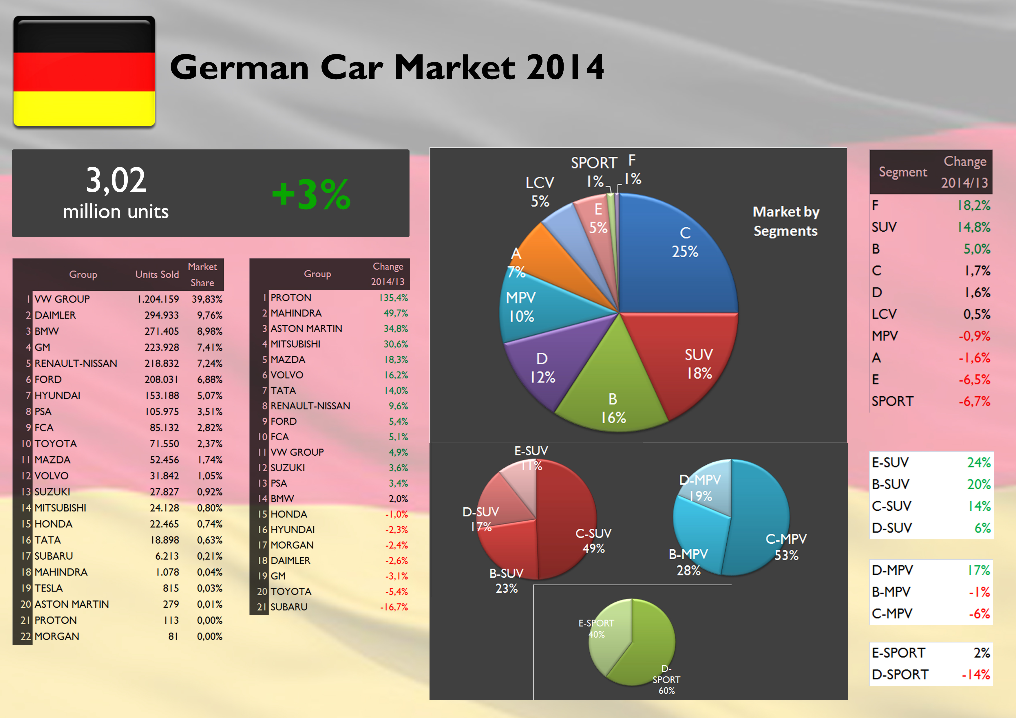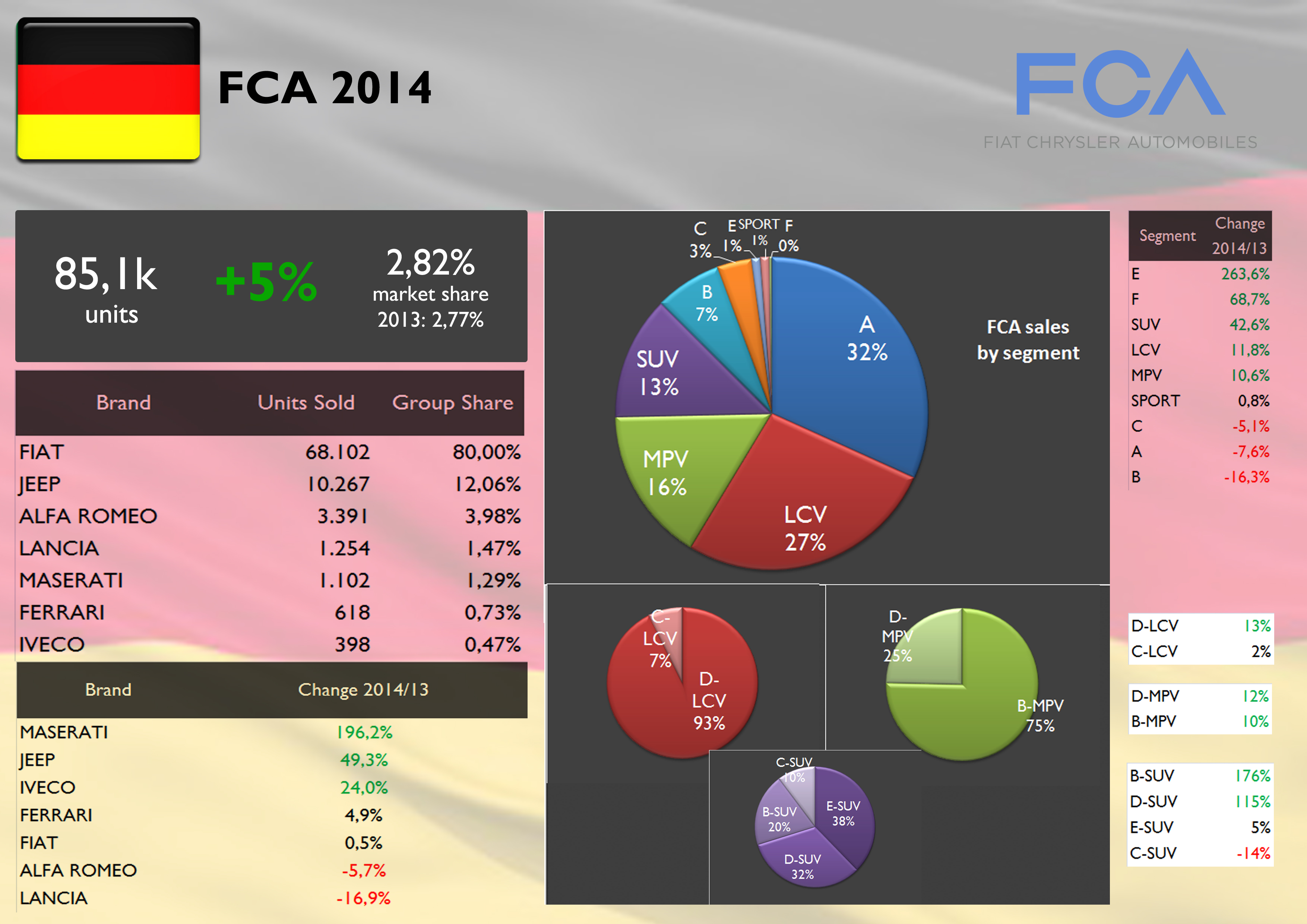 Germany tops the European car market by countries with more than 3 million units, up a tiny 3%. Thanks to a strong private and car rentals and company demand, many car makers sell a big quantity of cars. This is particularly true for the local auto makers such as VW Group, which controls almost 40%, and was followed by far by Mercedes and BMW. Renault-Nissan managed to outsold Ford at its “home” market, but it was the small Japanese makers the ones to post the biggest gains year-on-year. Germans love the compact cars (with the Golf ranking first by far), but SUVs sales increased 15% mainly because of the large and small ones. FCA outperformed the market rising its registrations by 5% thanks to Jeep, which continued to grow despite it is still a very small player. The group’s share is still very low and its sales still depend a lot on the city-cars and the LCV.