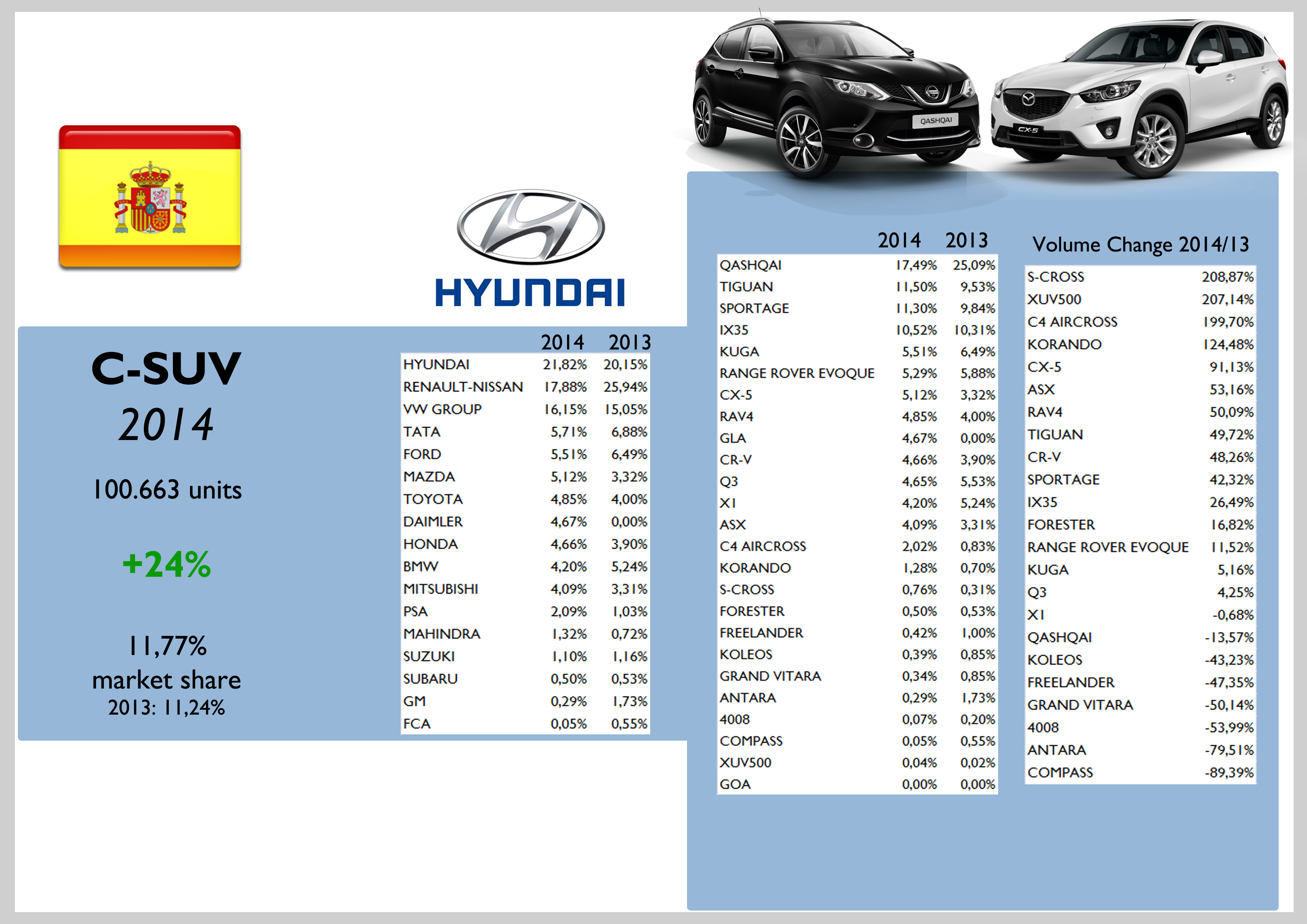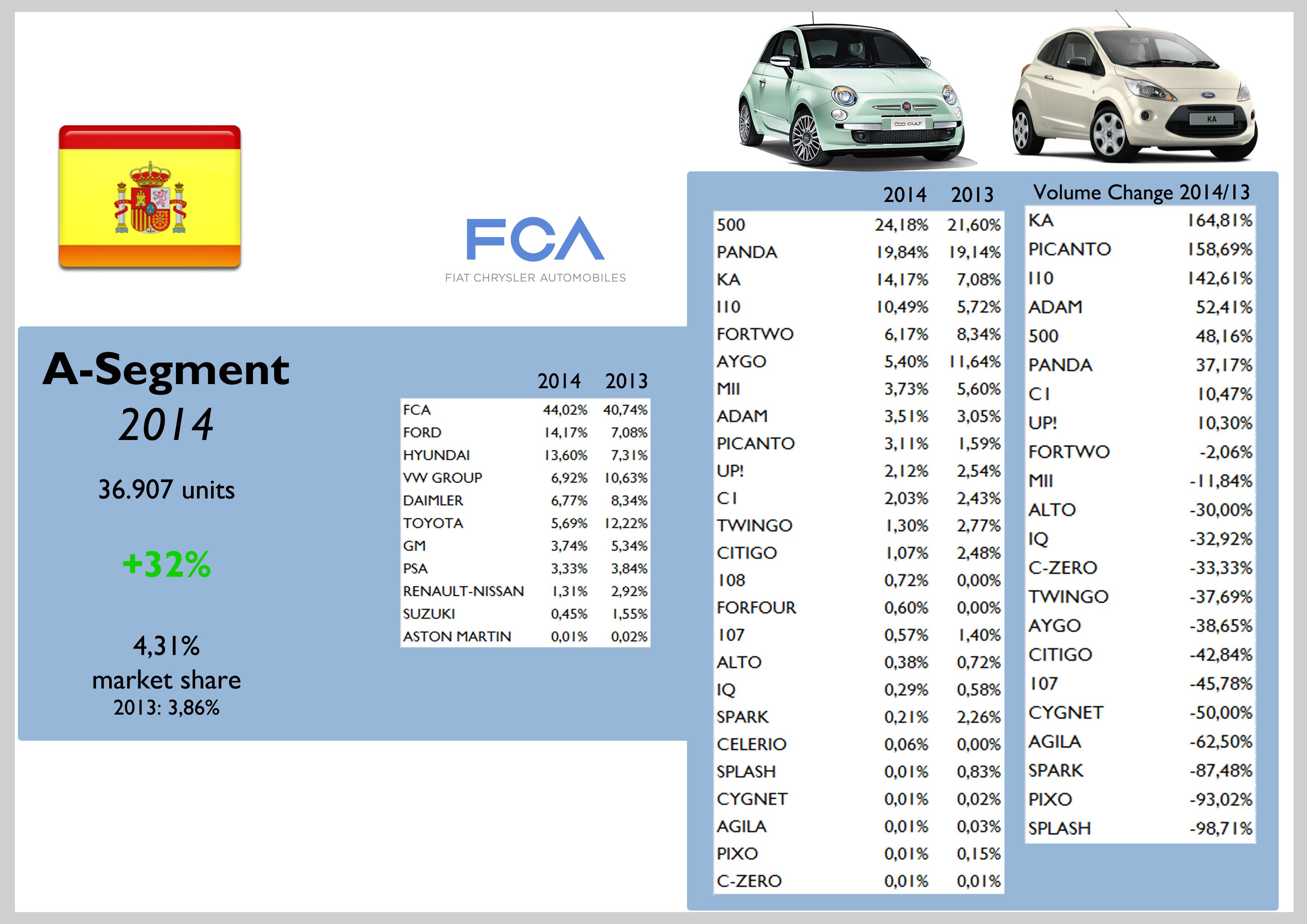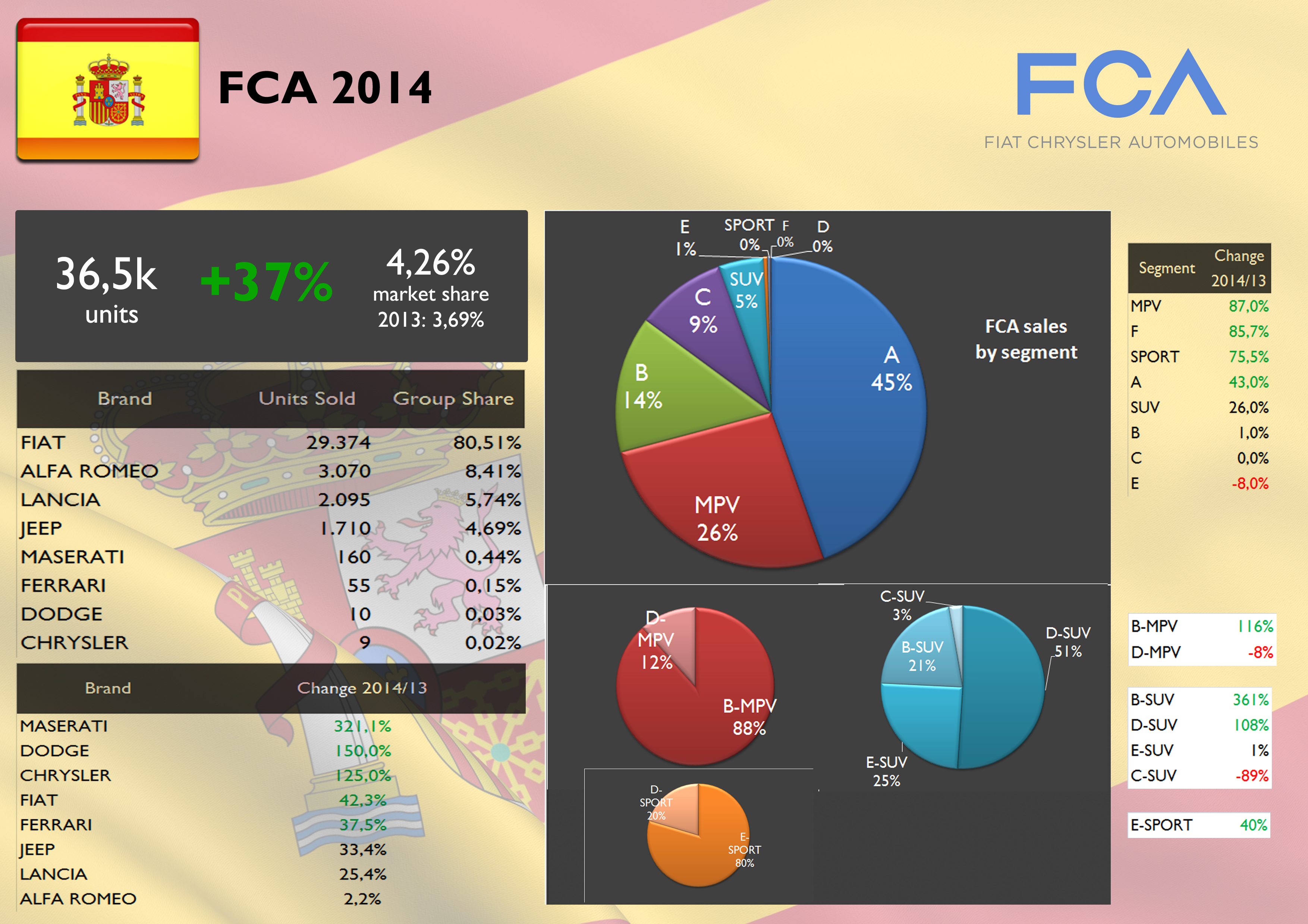 After some years of red numbers, the Spanish car market is back with sales up a massive 18%, but it is still far from pre-crisis figures (1,4 million units). VW group leads with almost 24% share but its sales grew less than overall market. Spanish prefer sub-compact and compact cars, but as it happened in the rest of Europe, SUV sales posted the highest grow, followed by the city-cars (which favoured Fiat). Premium cars lost share due mainly to BMW. In this positive context, FCA was able to more than double the market’s growth becoming the best performer of the top 10. Its market share jumped from 3,7% to 4,3%, outperforming the share of the other 3 European major markets: UK, France and Germany. The growth was possible thanks to Fiat brand and Jeep, but even Alfa Romeo and Lancia registered positive changes. In fact the 500 and Panda counted for 45% of the group sales in Spain, and they were followed by the big success of the 500L, which was the country’s best-selling small MPV. Jeep didn’t perform as in other countries, but the Cherokee had the highest grow in its segment and the Renegade should impact 2015 sales.
