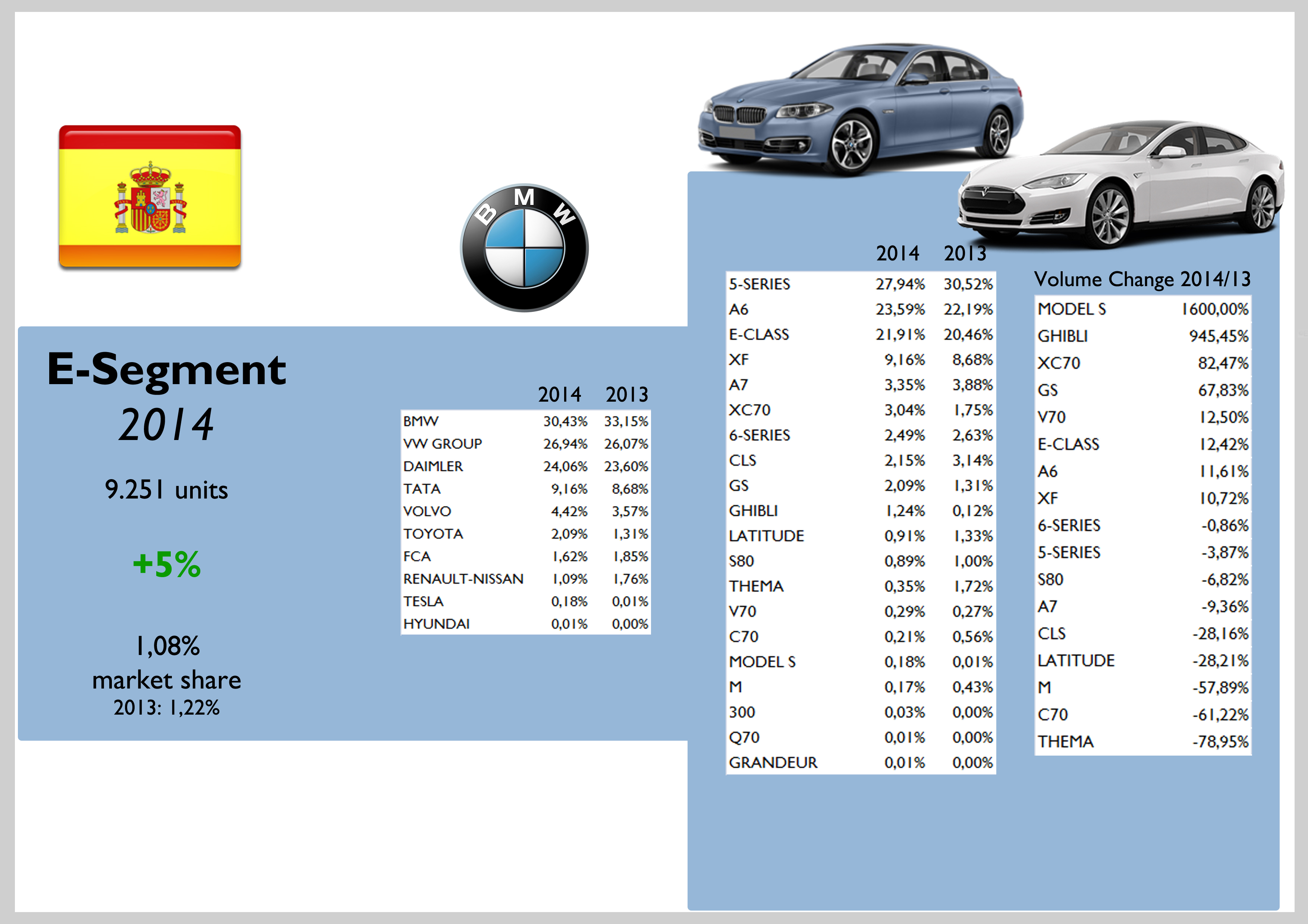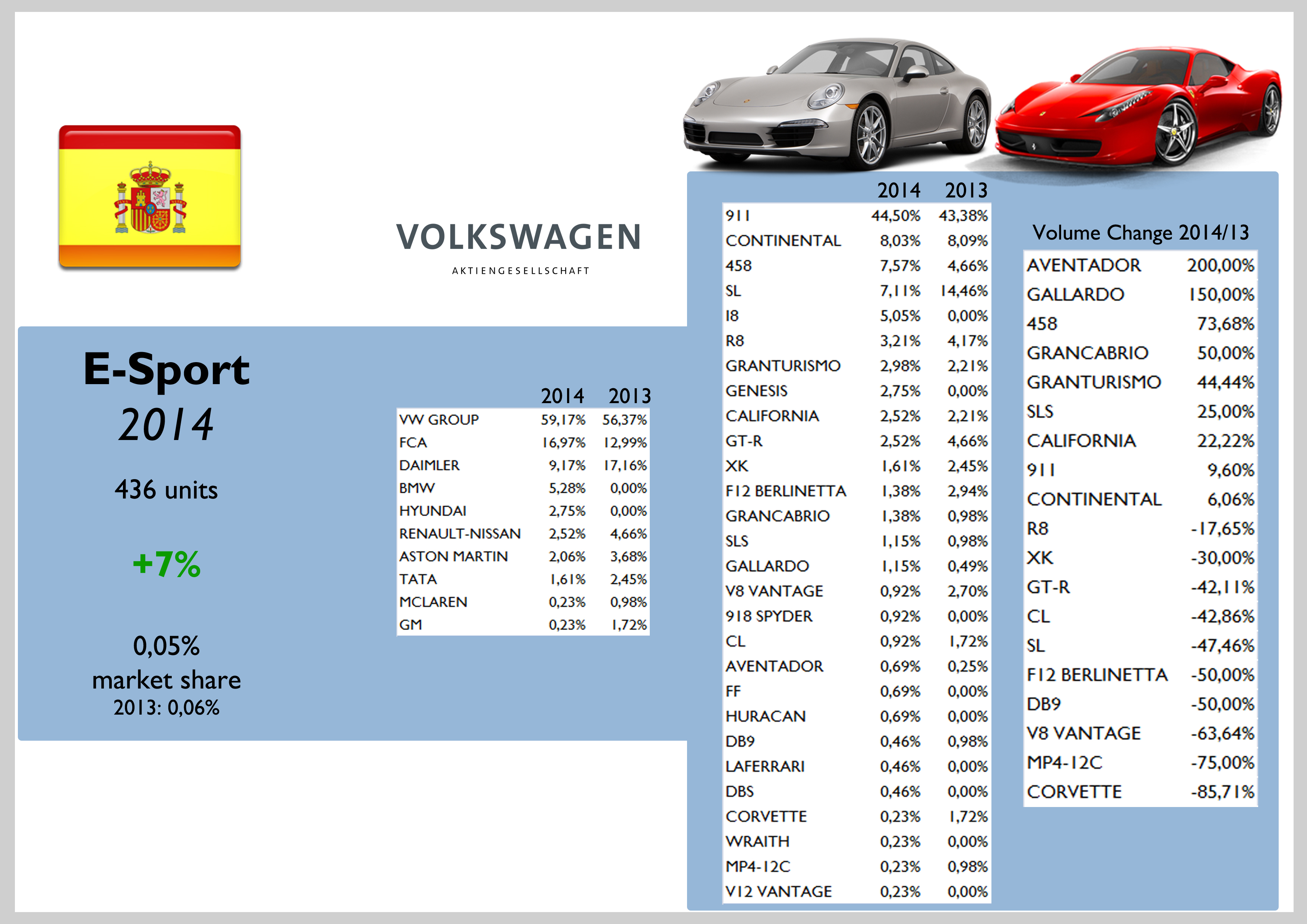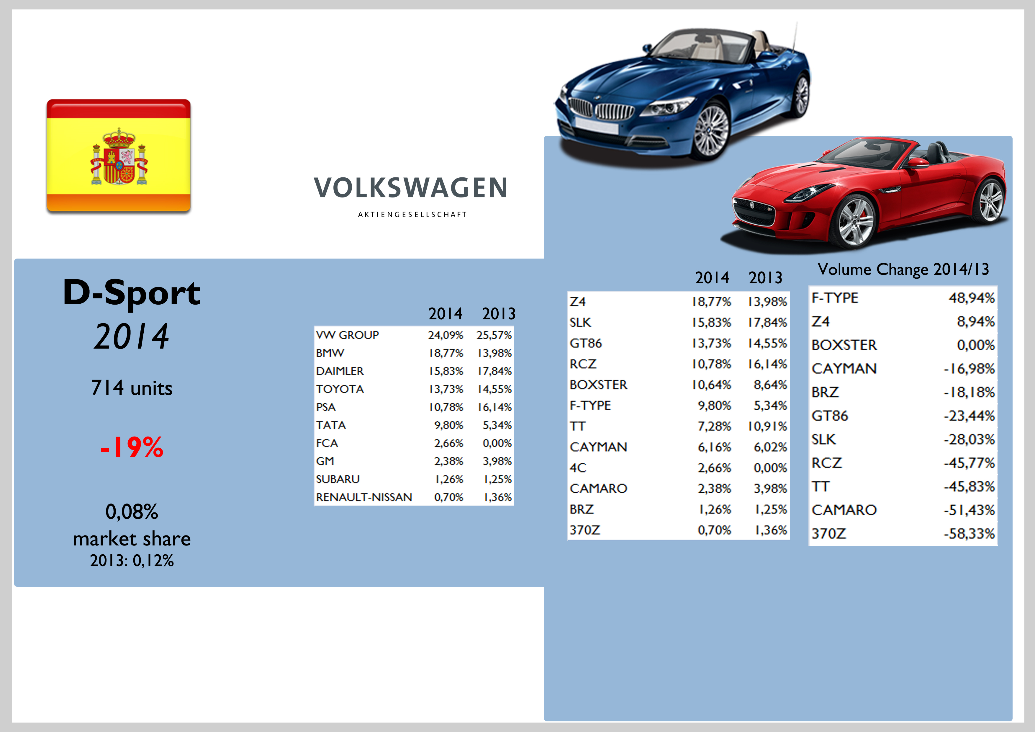 After some years of red numbers, the Spanish car market is back with sales up a massive 18%, but it is still far from pre-crisis figures (1,4 million units). VW group leads with almost 24% share but its sales grew less than overall market. Spanish prefer sub-compact and compact cars, but as it happened in the rest of Europe, SUV sales posted the highest grow, followed by the city-cars (which favoured Fiat). Premium cars lost share due mainly to BMW. In this positive context, FCA was able to more than double the market’s growth becoming the best performer of the top 10. Its market share jumped from 3,7% to 4,3%, outperforming the share of the other 3 European major markets: UK, France and Germany. The growth was possible thanks to Fiat brand and Jeep, but even Alfa Romeo and Lancia registered positive changes. In fact the 500 and Panda counted for 45% of the group sales in Spain, and they were followed by the big success of the 500L, which was the country’s best-selling small MPV. Jeep didn’t perform as in other countries, but the Cherokee had the highest grow in its segment and the Renegade should impact 2015 sales.