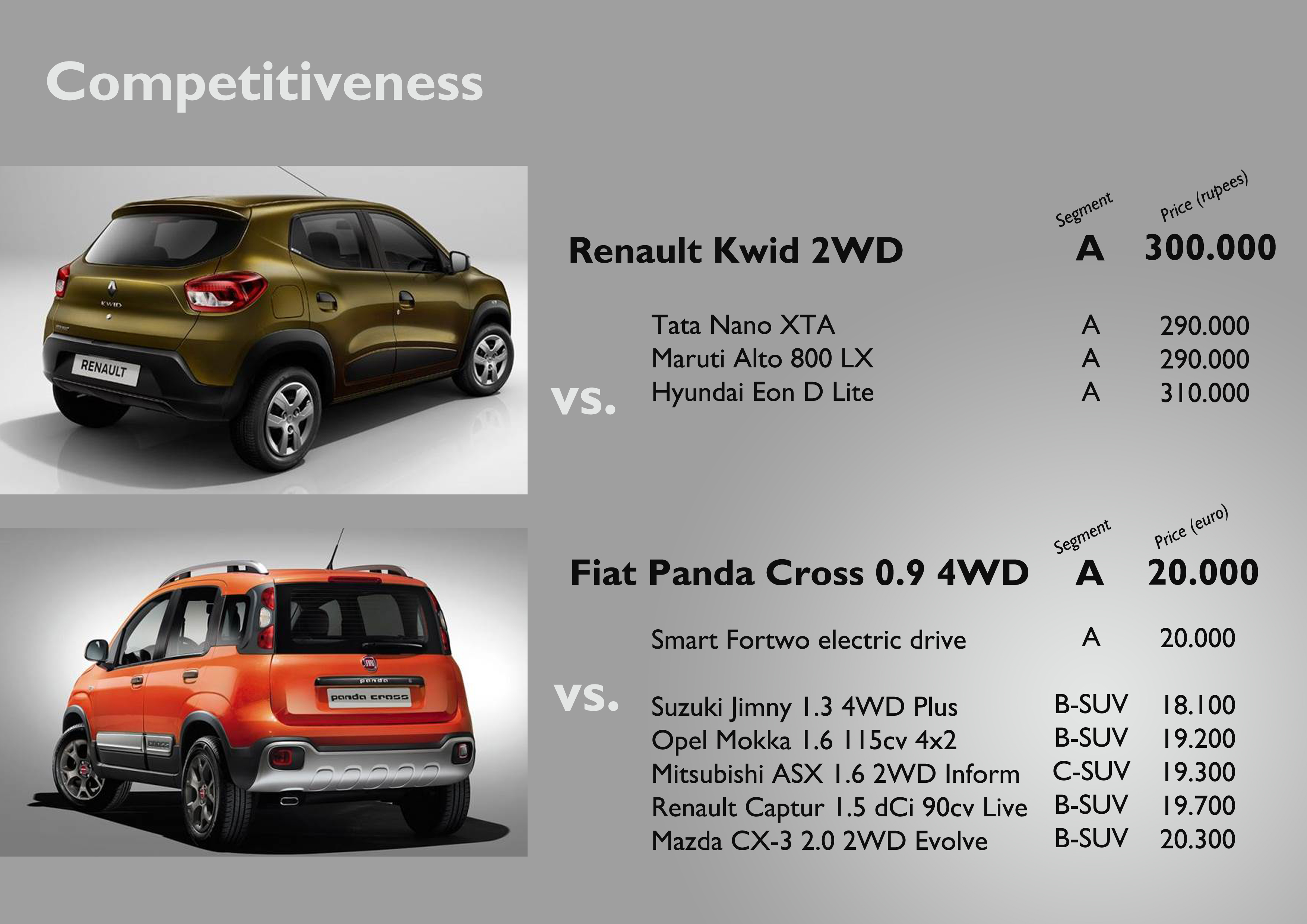 The Renault Kwid and the Fiat Panda Cross. The same idea, the same segment in different markets and targets. The Kwid will be priced starting at 4.000 euros vs. 20.000 euros for the Panda Cross.