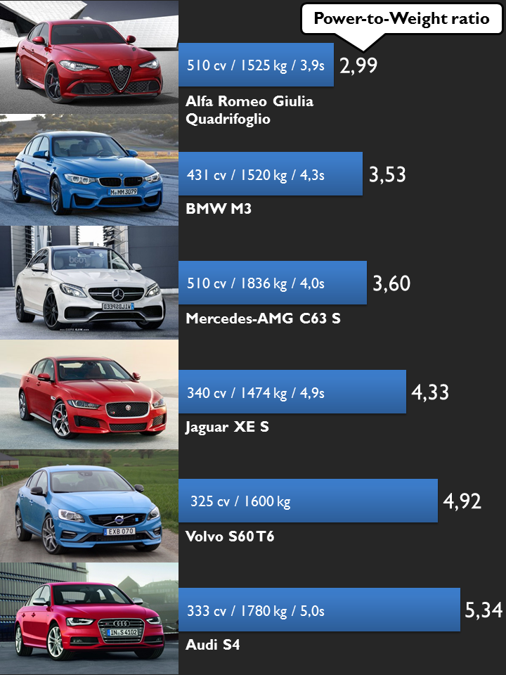 Based on what Alfa Romeo communicated on Wednesday, the Giulia Quadrifoglio has the best power-to-weight ratio of its segment as it’s powered by a 3.0 V6 Biturbo engine with 510 cv moving only 1525 kg. Thanks to that excellent ratio, the Giulia outperforms the eternal leader, the BMW M3 and the Mercedes-AMG C63 S (which is severely affected by its high weight). The Jaguar XE S, Volvo S60 T6 and Audi S4 are not considered direct rivals of the Giulia Quadrifoglio but they are also high-performance mid-size sedans. The new Audi S4 could surprise all and maybe outperform the Italian new-born. Source: cars.com, Alfa Romeo, Auto-Motor-und-Sport