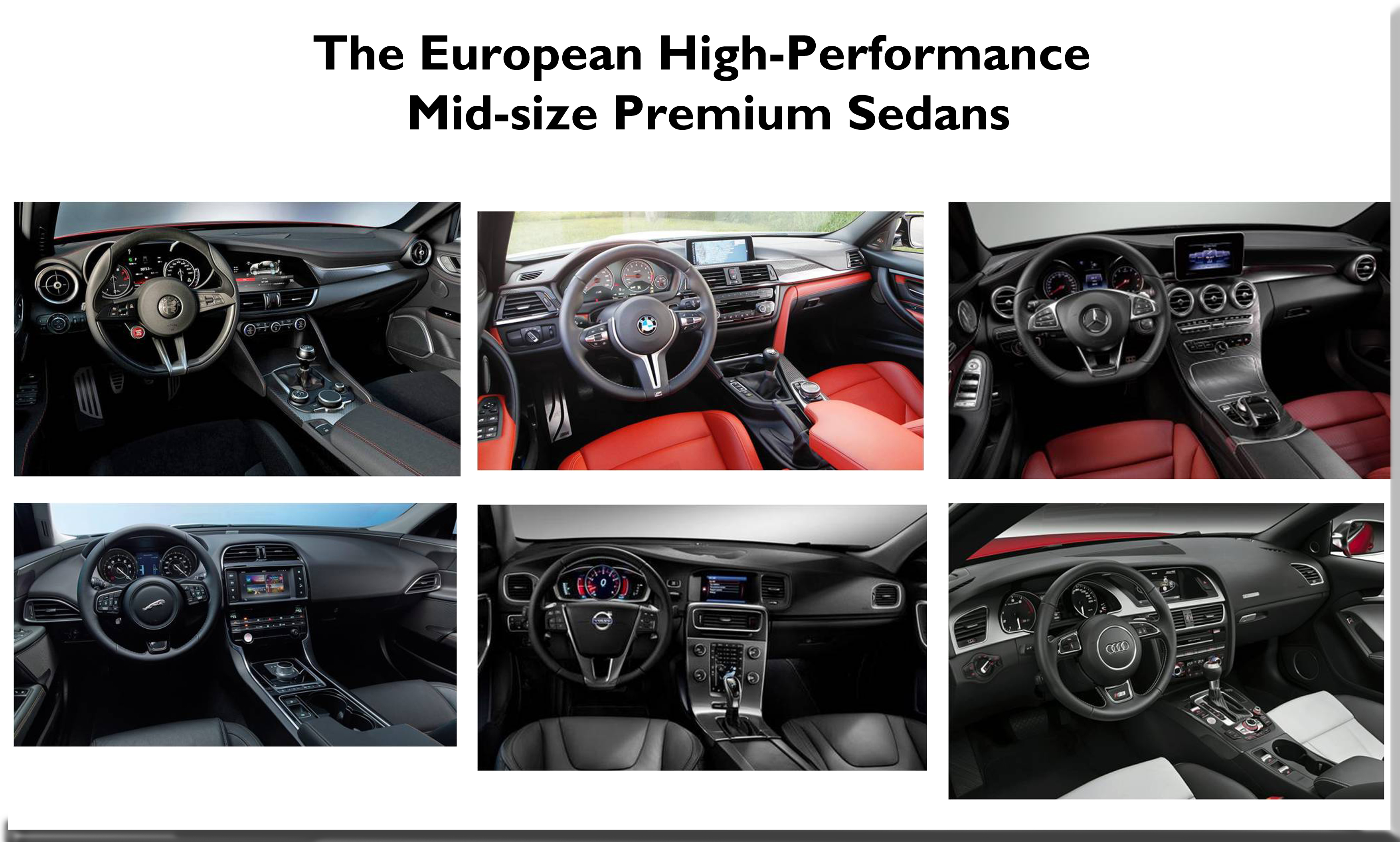 Interior view of the Alfa Romeo Giulia Quadrifoglio, BMW M3, Mercedes-AMG C63 S, Jaguar XE S, Volvo S60 T6 and Audi S4