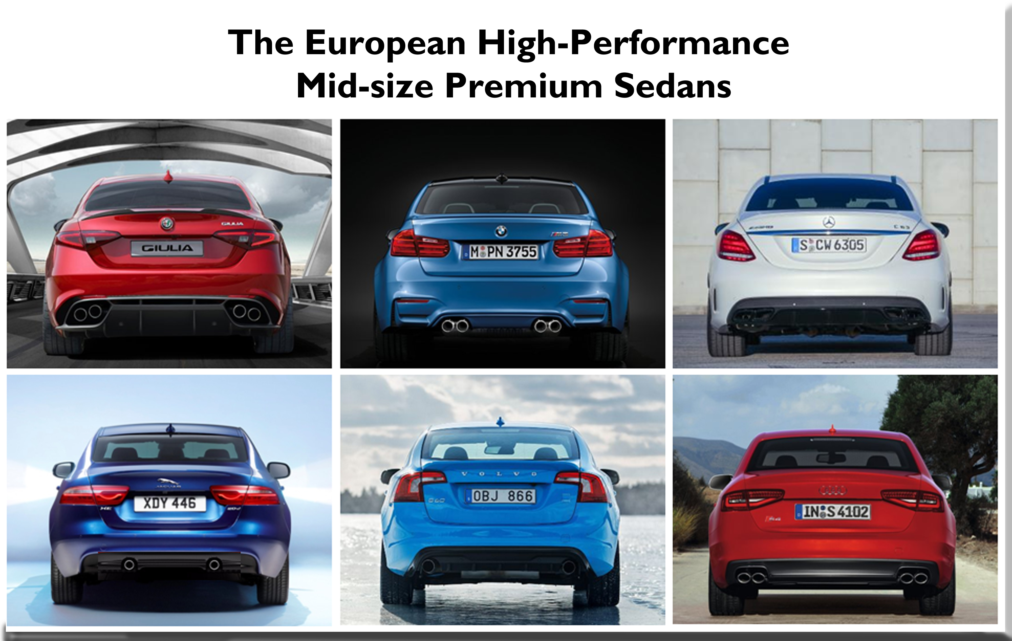 Rear-view of the Alfa Romeo Giulia Quadrifoglio, BMW M3, Mercedes-AMG C63 S, Jaguar XE S, Volvo S60 T6 and Audi S4