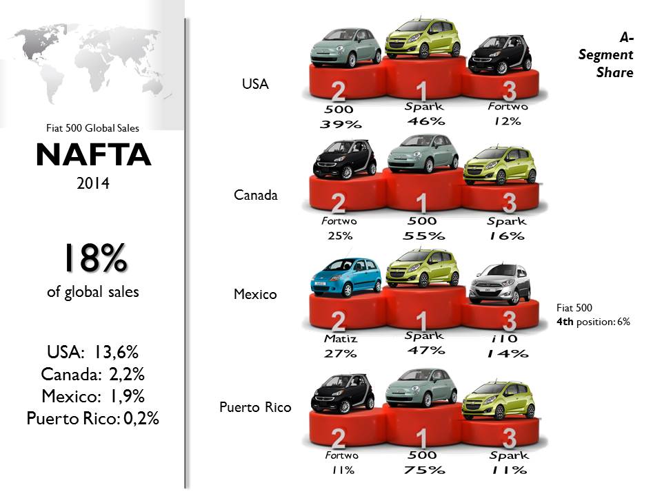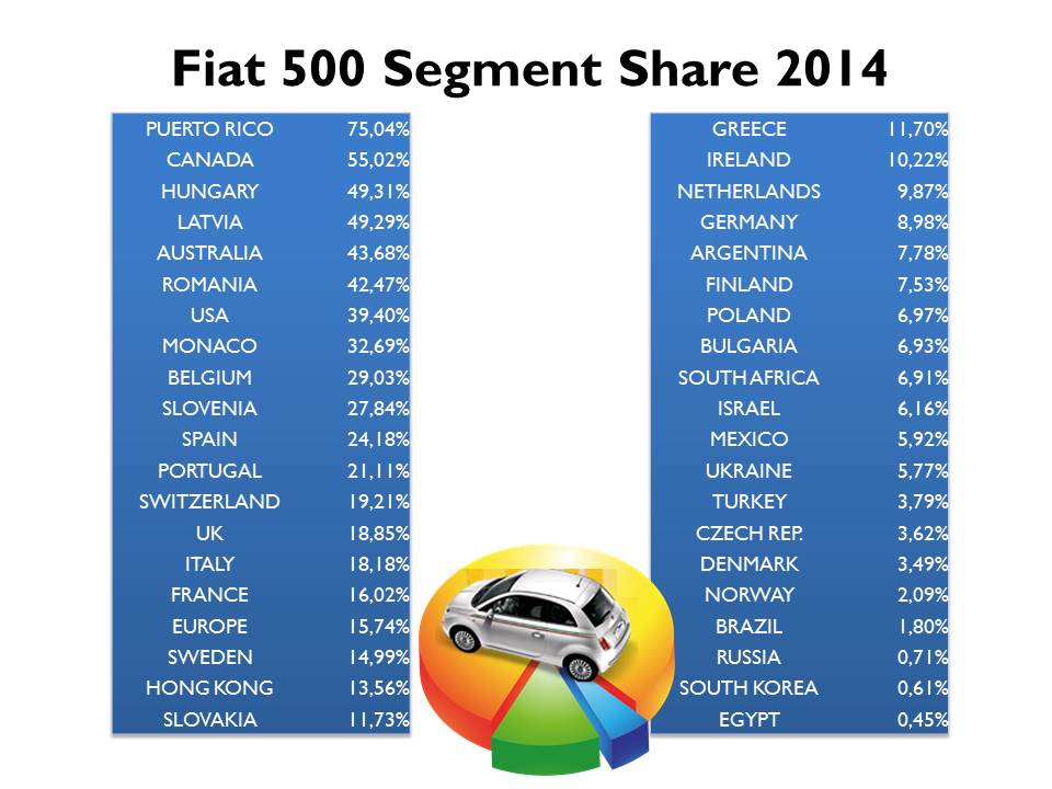 Due to tax regulations and exchange rates, the Mexican Fiat 500 became a very expensive car in Brazil and Argentina. Hence it lost some segment share during 2014. Marginal sales volume in Andean countries and Central America. Source: JATO, Bilimp, CCFA, KBA, EAA, UNRAE, Raivereniging, Carmarket, DRPCIV, ADS Slovenia, ANIACAM, Bilsweden, Auto-Schweiz, bestsellingcarsblog.com