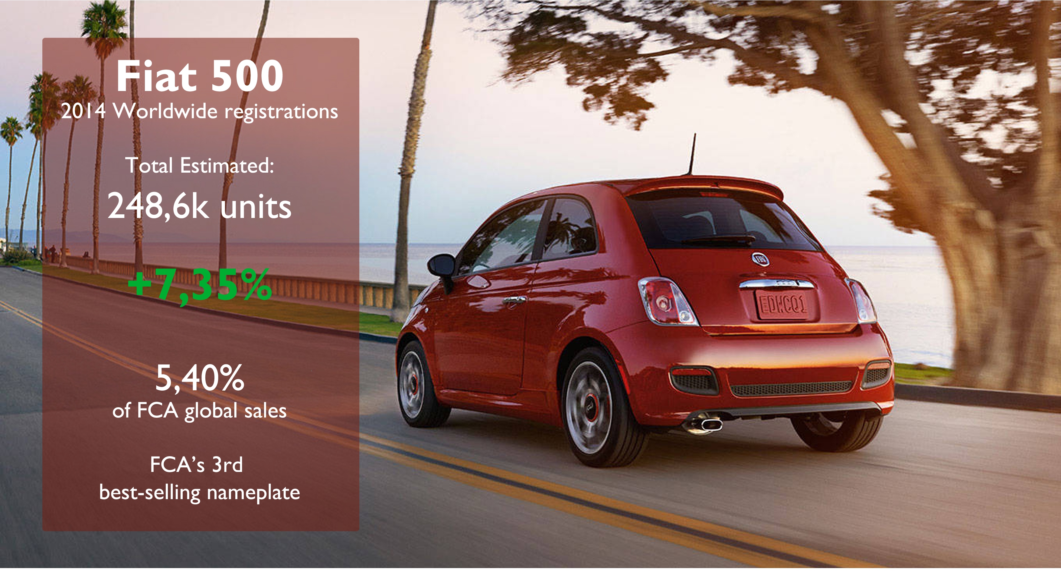 Fiat sold an estimated total of 248,6k units of its 500 nameplate in 2014. Source: JATO, Bilimp, CCFA, KBA, EAA, UNRAE, Raivereniging, Carmarket, DRPCIV, ADS Slovenia, ANIACAM, Bilsweden, Auto-Schweiz, bestsellingcarsblog.com