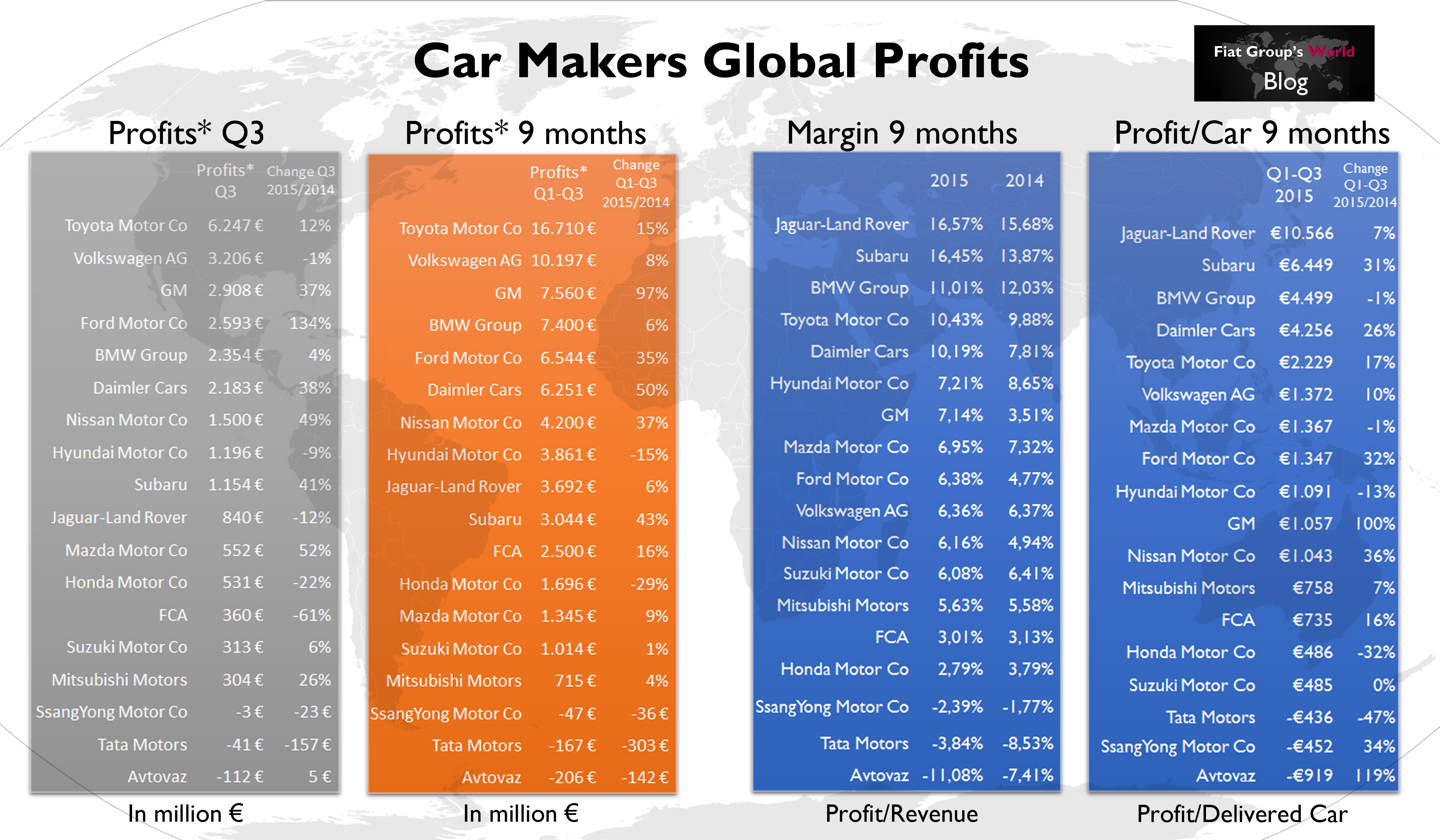 18 car makers published their profits information and there are some differences between the way they calculate them. Therefore this analysis includes only the EBIT or Operating Profits, which are not the same but is the closest way to have a sort of comparison between them. During the third quarter Toyota reported a 12% increase in profits to 6.2 billion euros, the world’s highest in the automotive industry. However it wasn’t the highest margin (EBIT or Op. Profit/Revenue) of the list, as this ranking was topped by Subaru (more than 18% margin), Jaguar-Land Rover, Toyota, Daimler Cars and BMW Group. Lada, Ssangyong and Tata lost money in 2015-Q3. For each car delivered Jaguar-Land Rover earned 7.623 euro. FCA earned only 323 euro.