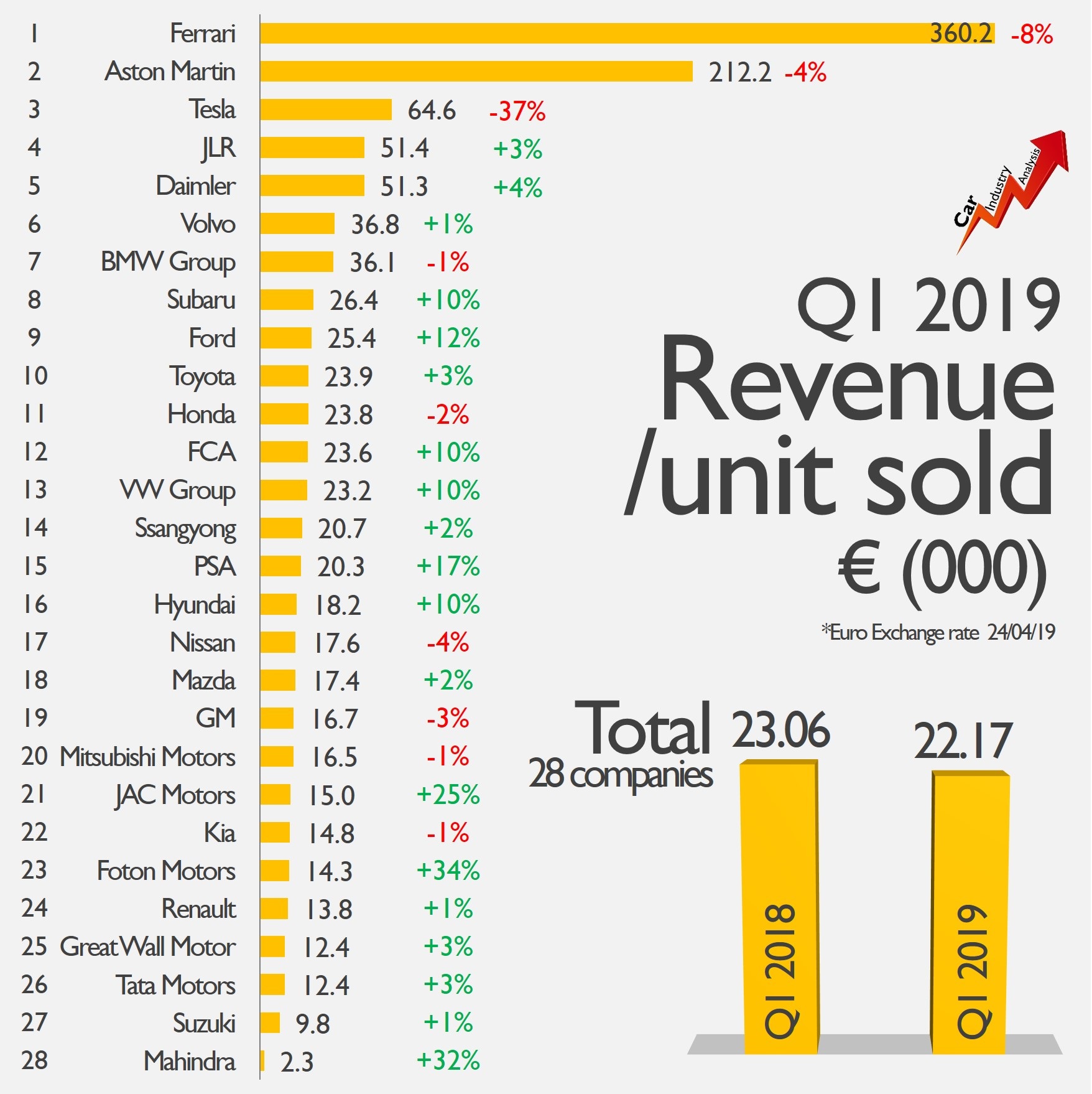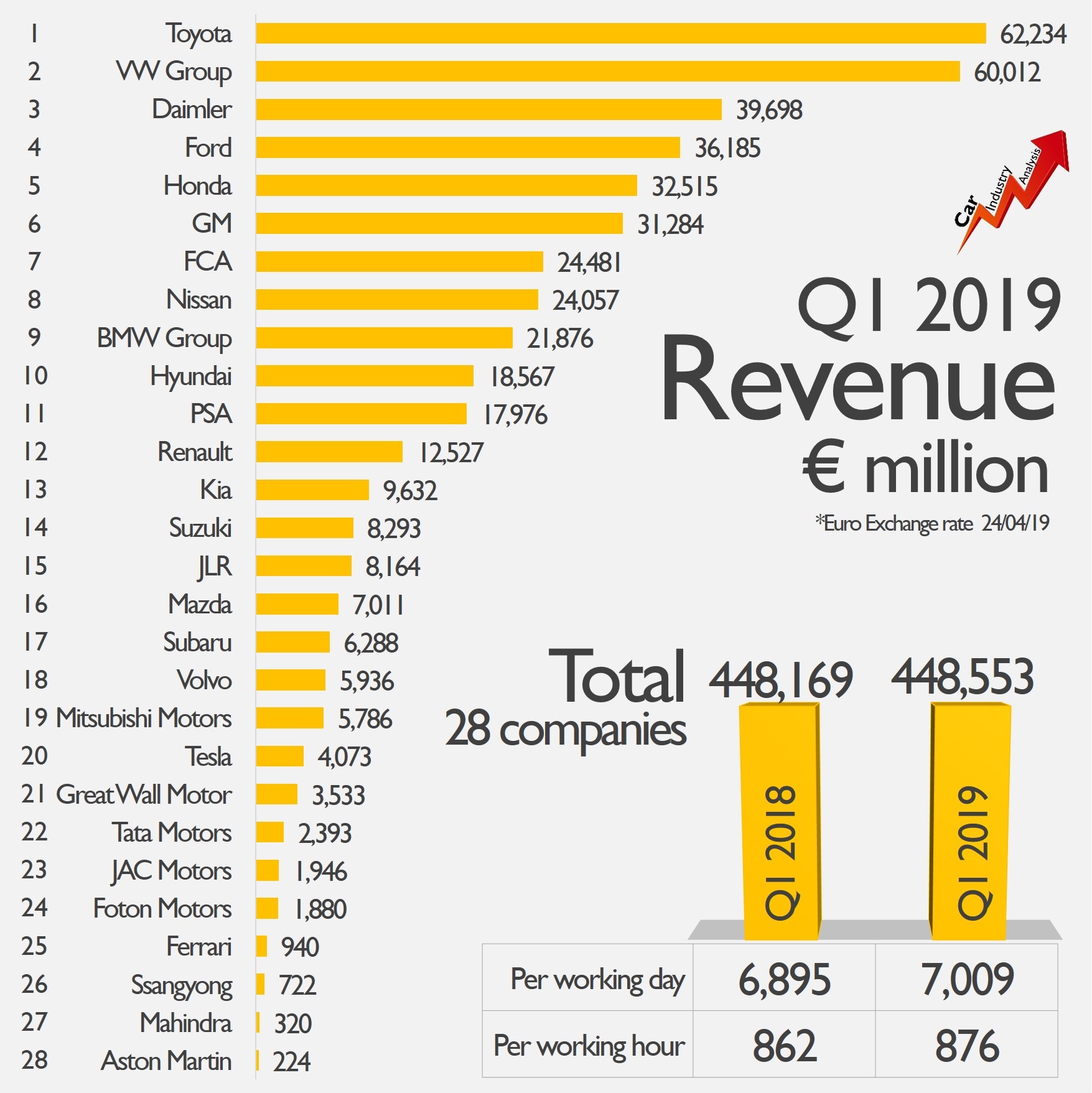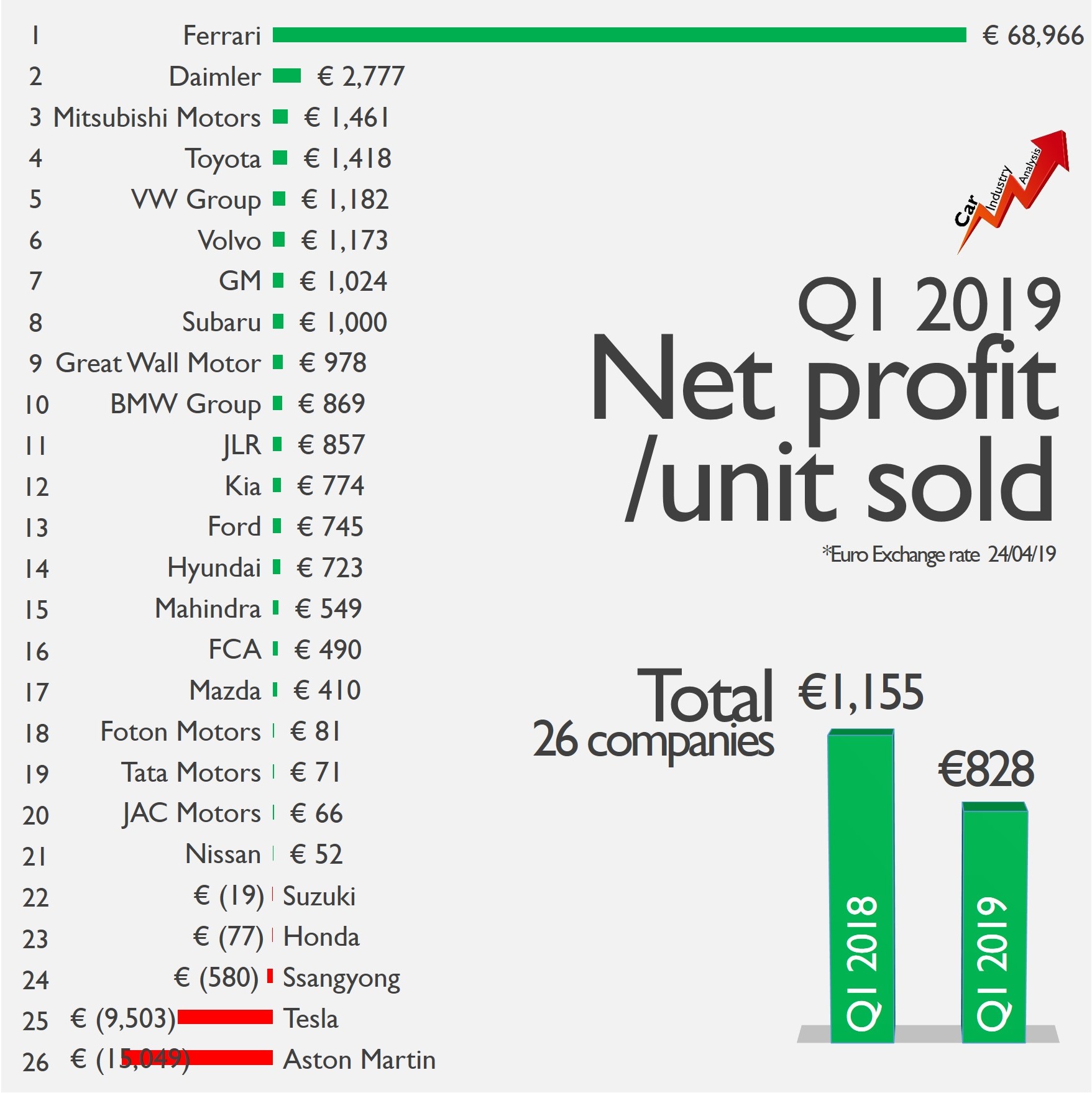 Q1-19 Financial results for: Aston Martin, BMW Group, Daimler (trucks included), FCA, Ferrari, Ford, Foton Motors, GM, Great Wall Motor, Honda (all business included), Hyundai, JAC Motors, JLR, Kia, Mahindra, Mazda, Mitsubishi Motors, Nissan, PSA, Renault, Ssangyong, Subaru, Suzuki, Tata Motors, Tesla, Toyota, Volvo, VW Group. Renault & PSA do not disclose profit information.