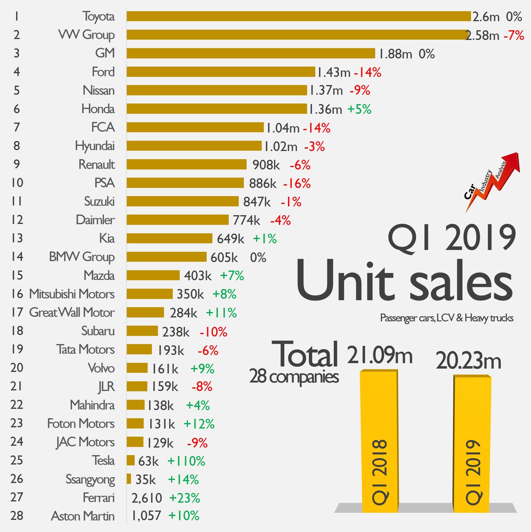 Although revenue remained stable during the quarter, fewer vehicles were sold than during the same period in 2018. In total the 28 automakers sold 20.23 million vehicles (made up of passenger cars, light commercial vehicles and heavy trucks). This was 861,000 less than in Q1 2018 – a 4.1% decrease. The difference between the revenue made and the amount of vehicles sold means that despite the challenges, the automakers were able to increase the average prices of their vehicles.
