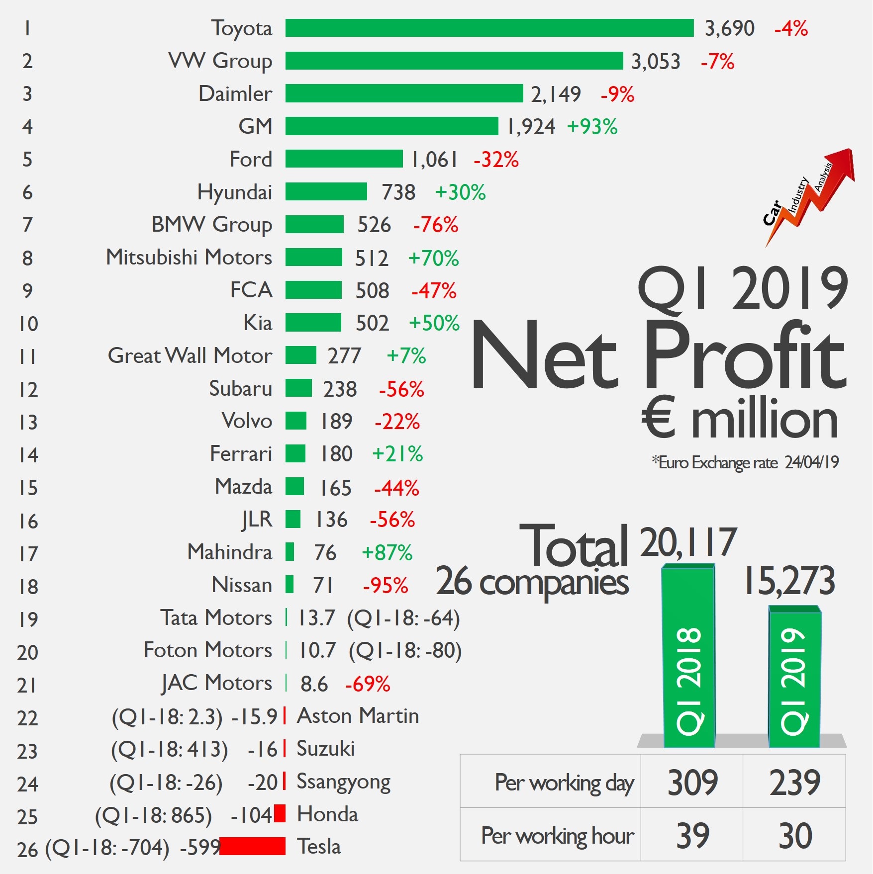 In Q1 2019, the net profit of the 26 companies (excluding Renault Groupe and PSA as neither release profit information by quarter) totaled €15.27 billion. Unlike revenue and sales volume, profits fell by 24% due to losses from key players like Honda, Suzuki and Tesla, and big drops in profits posted by Nissan, BMW Group, Subaru, JLR and FCA.