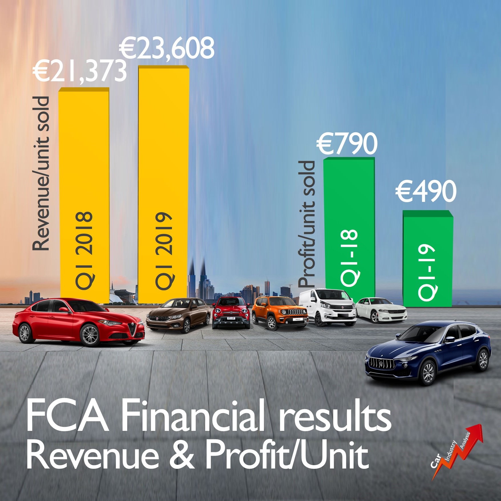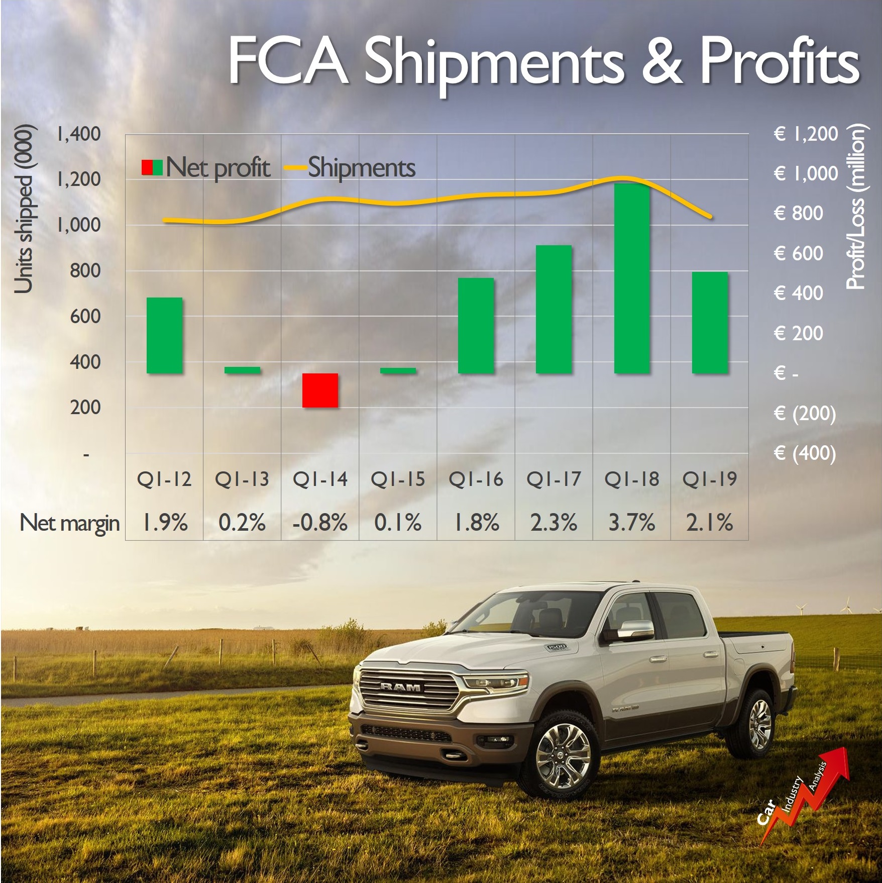 The first thing to consider in the comparison is that FCA was the 9th largest group by net profits in Q1-19. It was outperformed by the usual suspects (VW Group, Toyota, Daimler, GM and Ford) but also surprisingly by the likes of BMW Group and Mitsubishi Motors. The net profits of FCA fell almost twice the overall drop (-24%).
