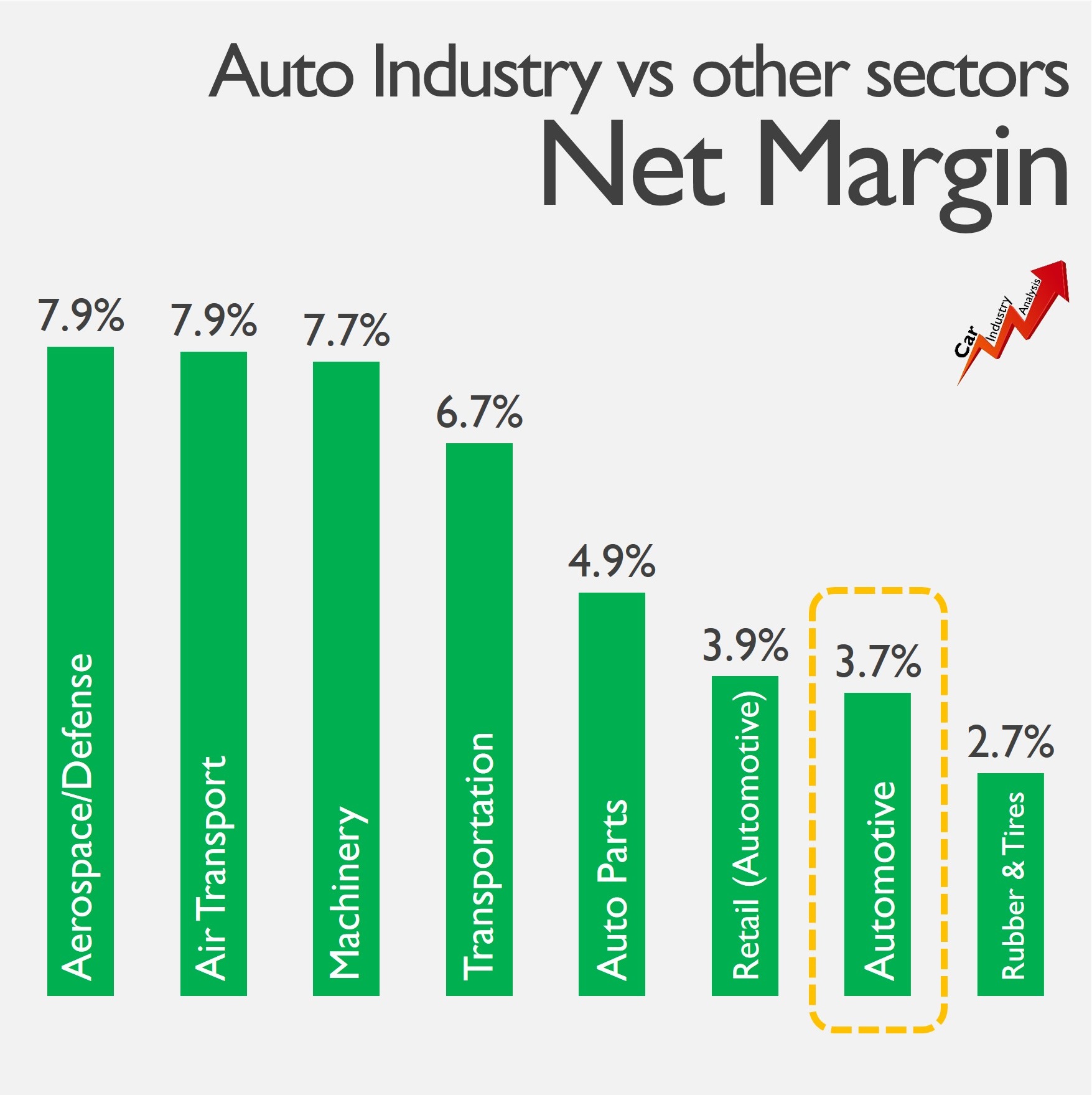 As a matter of context, the automotive industry’s net margin is miles away from the 23.8% margin published by the software (Internet) industry, or the 16% recorded by the software (entertainment) industry. It is even lower than the troubled aerospace/defense industry, where the net margin is around 7.2%.