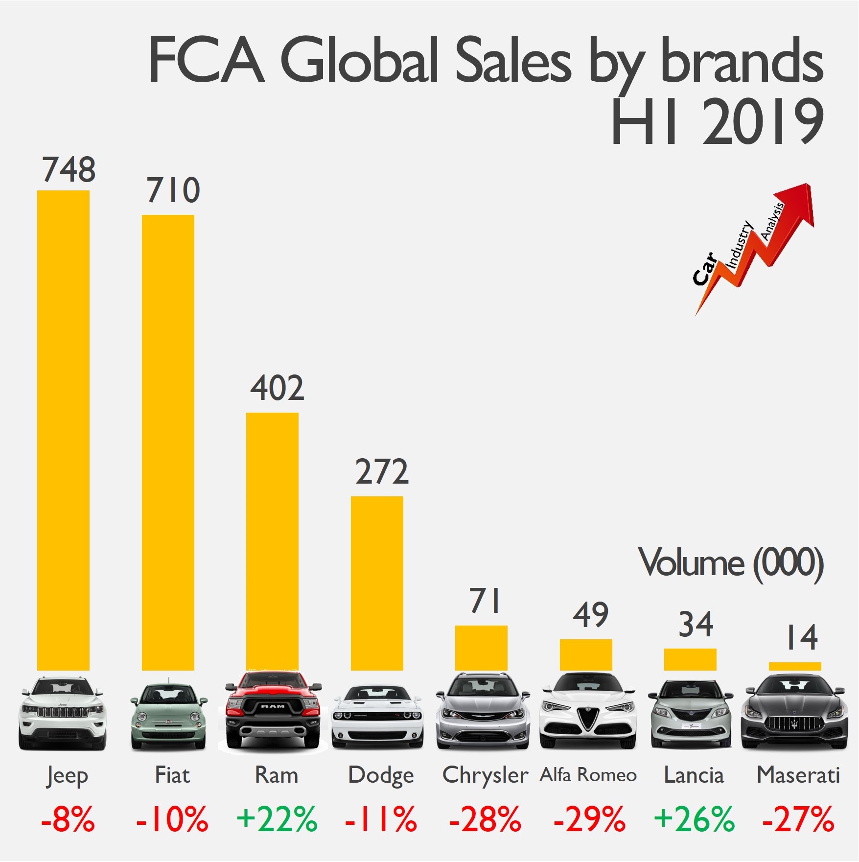 Fiat Chrysler was one of the Western automakers (Chinese excluded) to post the highest market share lose in the SUV segment during the first half. While total SUV global sales fell by 3.1%, FCA posted a decline of 8% during the same period, with its volume falling from 992,300 units in H1 2018 to 908,100 units in H1 2019.