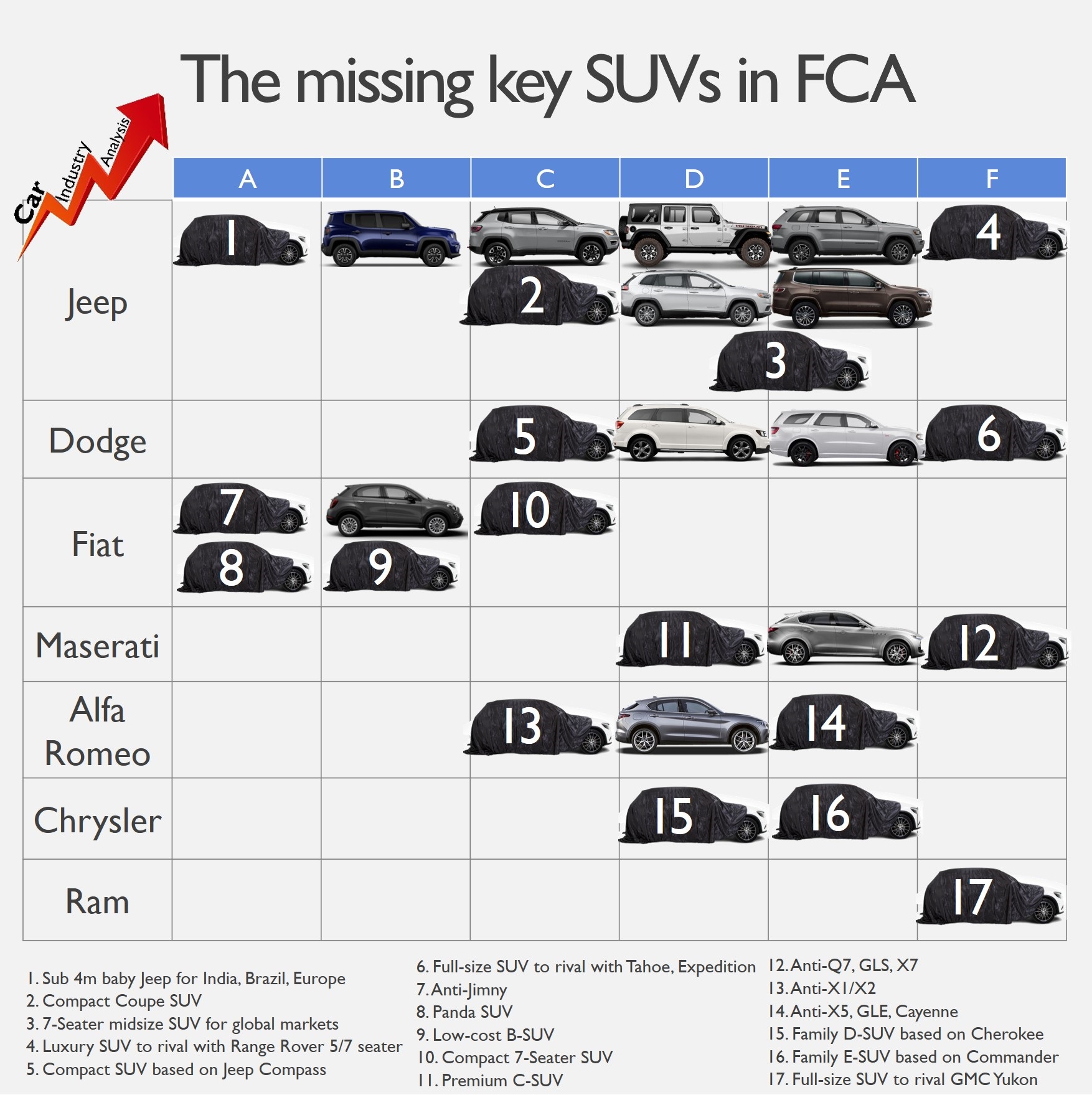 The brand continues to lag behind its rivals in terms of choices: only 5 global models. There are not 7-seat Jeeps for global markets; there is nothing smaller than the 4.25m long Renegade (did anyone say India?). There are not coupe SUVs (the new trend). And there is nothing more luxury than the Grand Cherokee. Jeep needs more products.