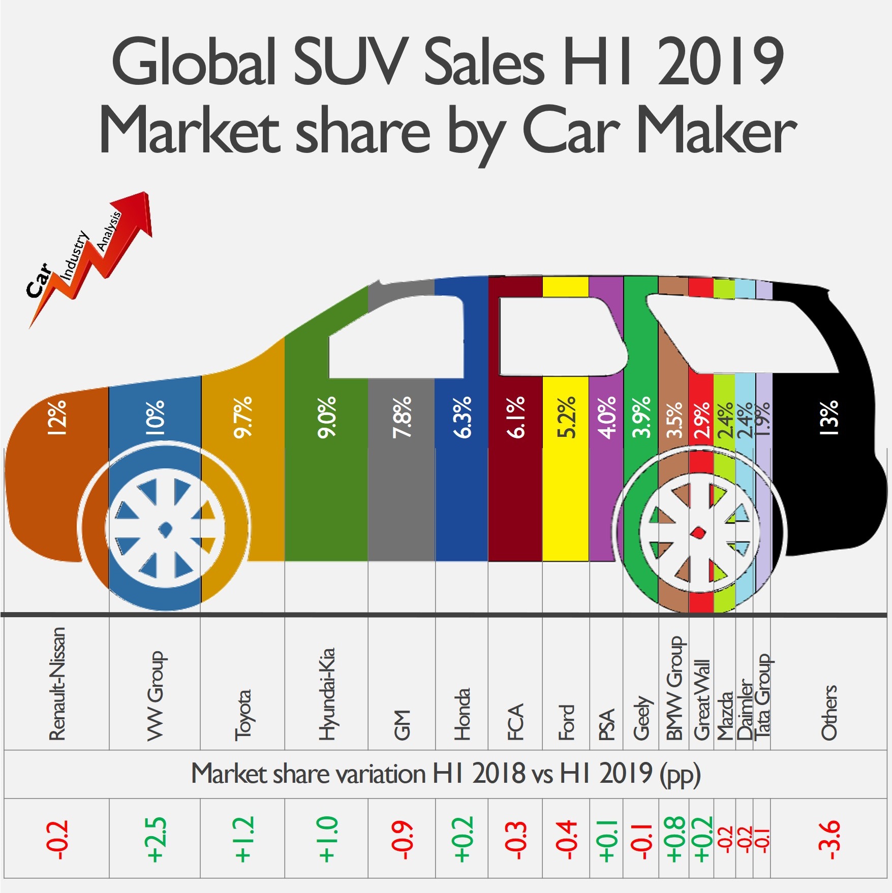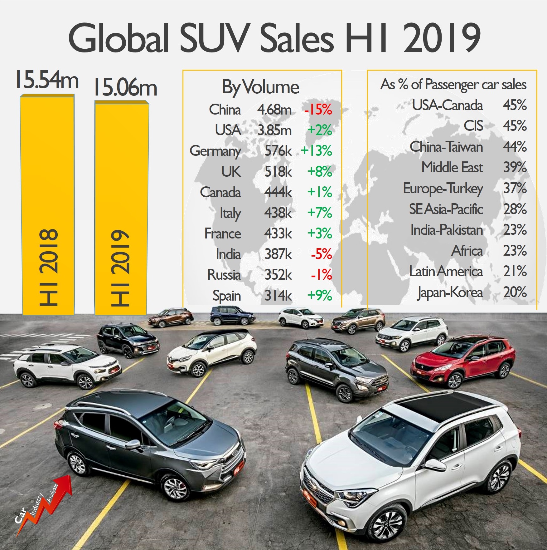 SUV global sales fell by 3.1% in the first six months to 15.06 million units. One year earlier, between January and June 2018, SUV volume totaled 15.54 million units. Although it is first drop registered since the start of the SUV boom some years ago, market share jumped from 35.9% in H1 2018 to 37.5% this year (of passenger cars).