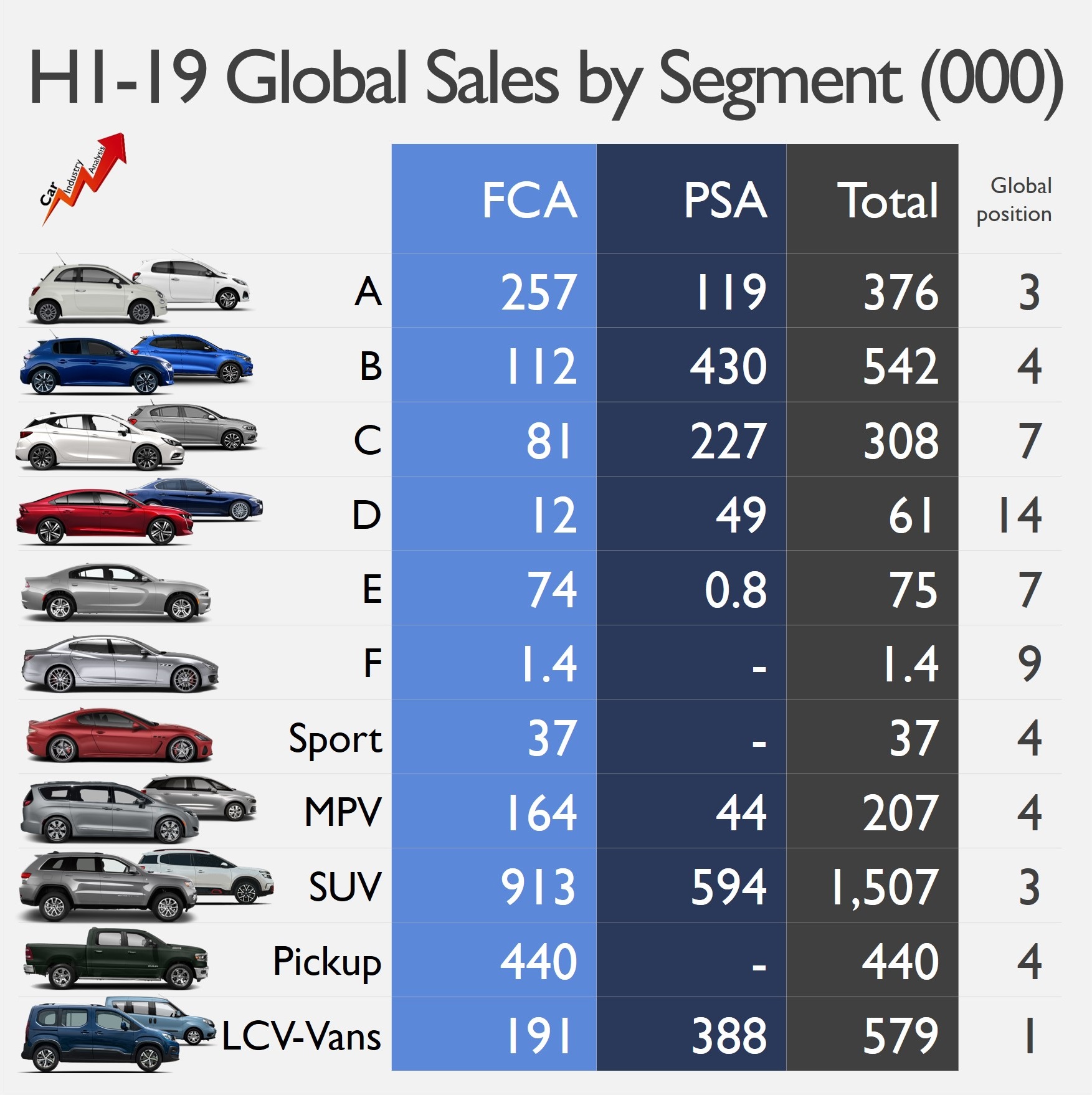 Despite its dominant position in key segments in Europe and Latin America (FCA+PSA also lead the LCV/Vans segment and is the second SUV seller behind Renault-Nissan), the agreement is not enough to reach the current sales levels of the world’s top 3 automakers. FCA and PSA combined sold 4.16 million vehicles in H1 2019. That is 680,000 units less than the total sold by Renault-Nissan. Still, it is significant to be ahead of General Motors by 430,000 units.