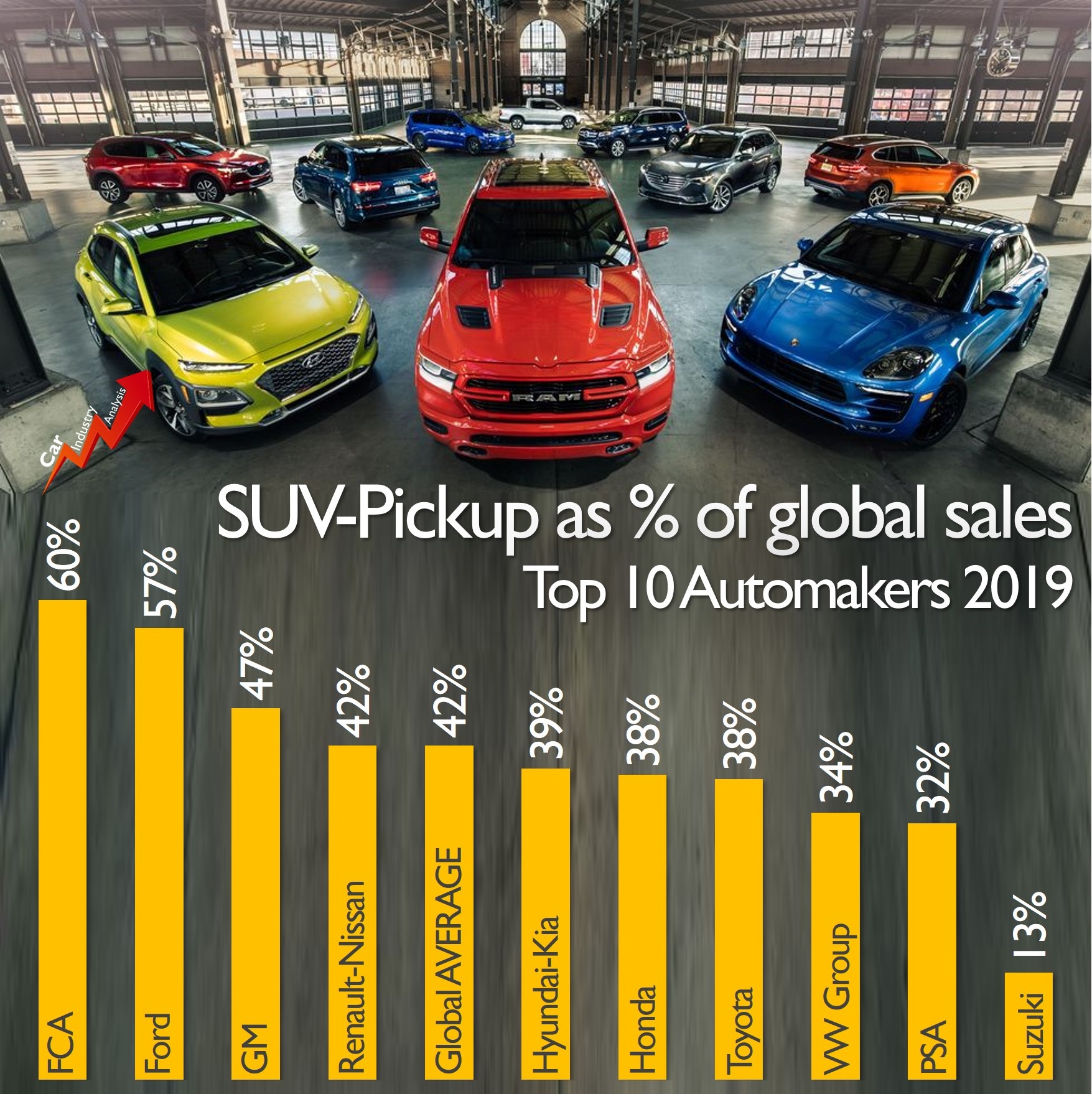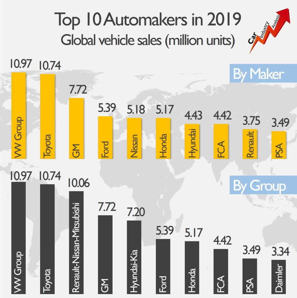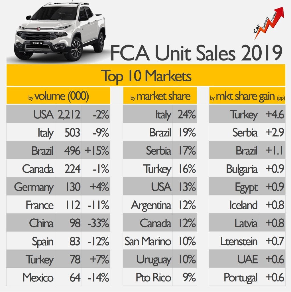 From the top 10 global car makers, Fiat Chrysler recorded the highest SUV/pickups penetration in terms of sales. With 4.42 million units sold, FCA registered an 8.8% reduction from 2018. It was still the 8th largest OEM in the world, behind Honda with 5.17 million units, and ahead of PSA with 3.49 million units. This year, the merger between FCA and PSA will allow them to occupy the fourth position based on last year’s volume. They outsold GM with 7.91 million units against 7.72 million units for the American maker.