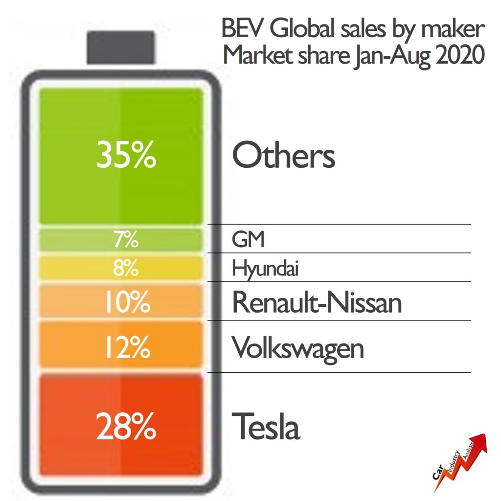 Tesla’s market share in Europe’s BEV market was 14% in Jan-Aug 2020; its market share was 27% in Jan-Aug 2019.