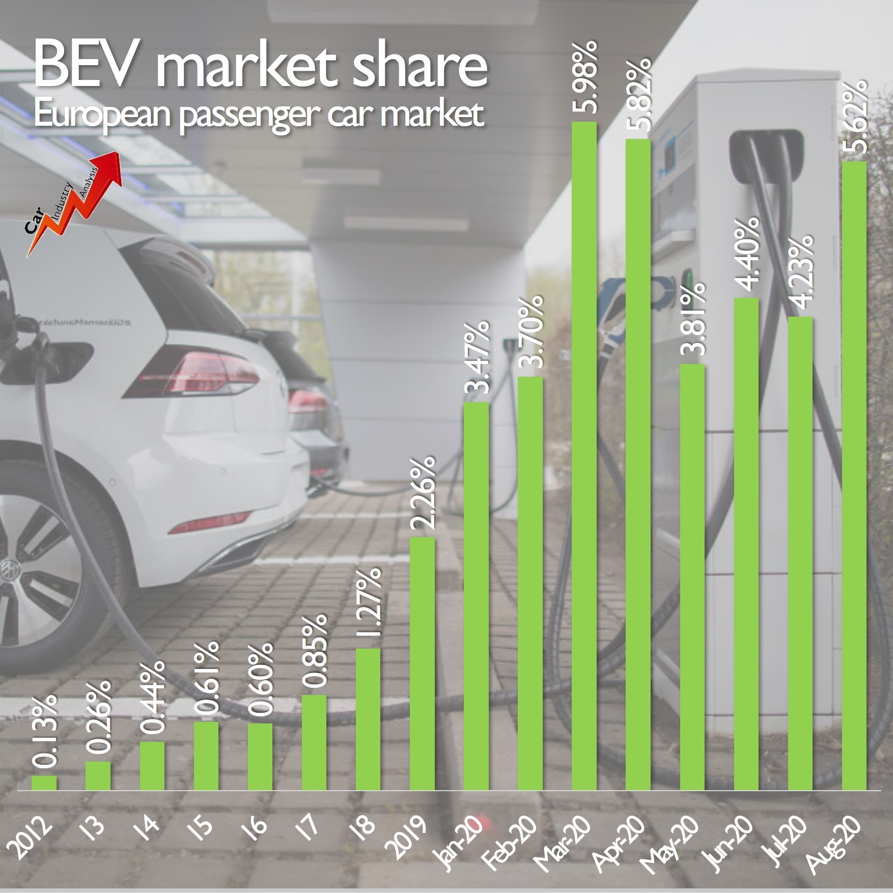 Despite the big COVID-19 hit, the demand of pure electric cars is growing in Europe more than anywhere else. Registrations of electric passenger cars in 23 countries totaled 320,500 units through August 2020, up by 53%. The massive growth contrasts to strong decrease posted by gasoline and diesel cars, down by 40%. Consequently, the BEV market share jumped from 2.0% in Jan-Aug 2019 to a record of 4.5% this year.