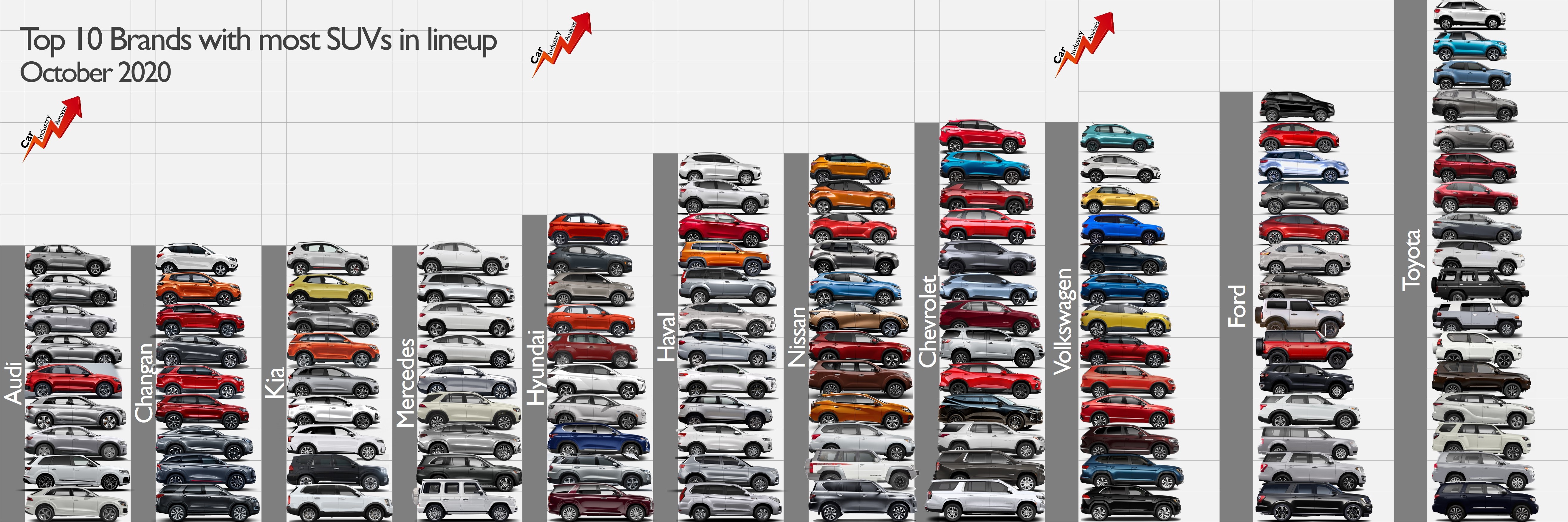 Volkswagen is only outpaced by Toyota in total number of SUVs available. Consumers can chose from 17 different SUVs branded Toyota that go from the little Toyota Raize up to the massive Toyota Sequoia. However, it still needs to do more in the lower segments, where most of the growth is happening now.