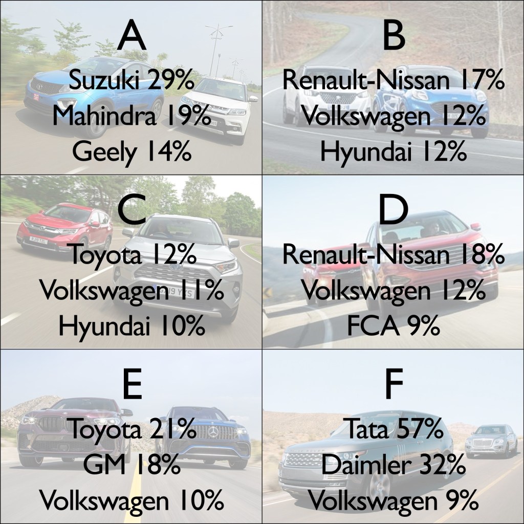 SUV leaders in 2019. Top selling car groups (market share) by SUV segment