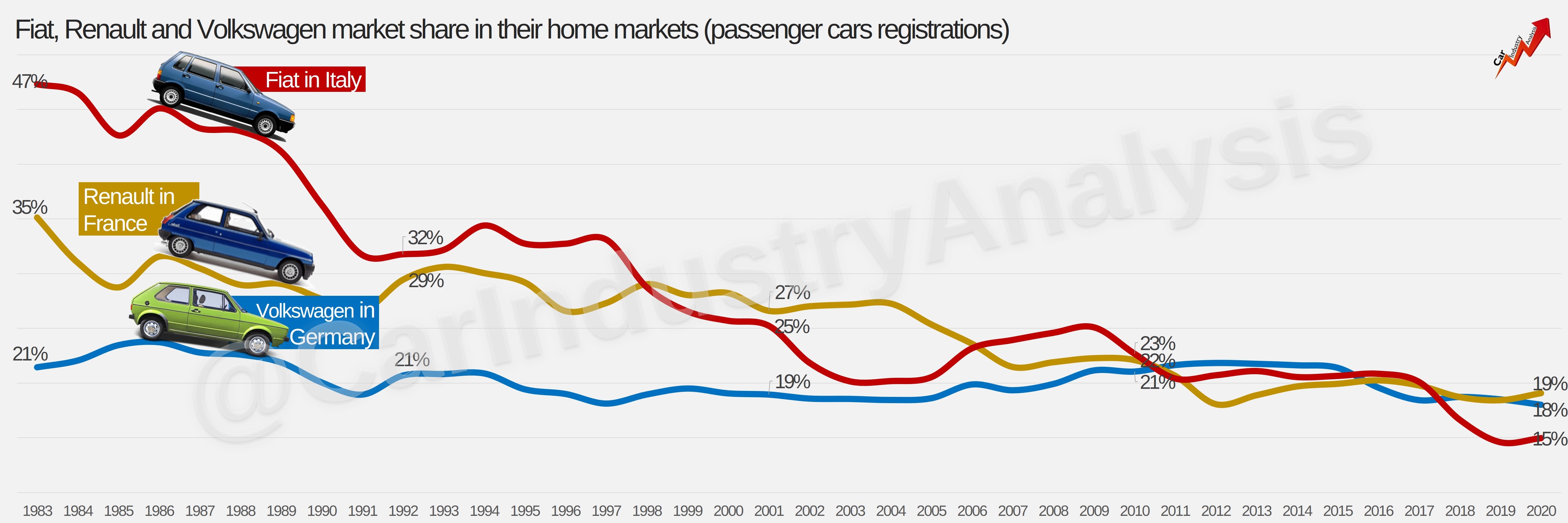 In addition to this, Fiat abandoned the low profitable but volume-important B-Segment, when it discontinued the Fiat Punto without a successor. The B-Segment is Europe’s largest by volume (SUV segment split by subsegments) with 2.23 million units registered in 2020, or 18.7% market share. It was followed by the C-Segment (17.5% market share) and C-SUV (16.5%). In countries like Italy, these cars counted for 22.2% of all registrations in 2020.