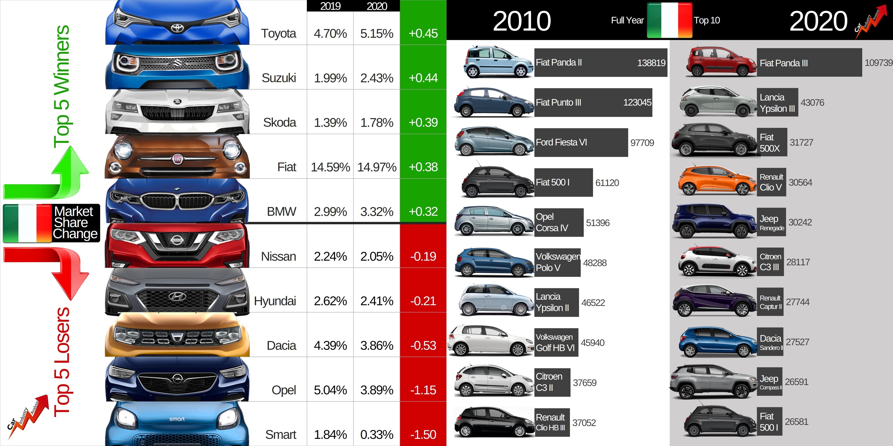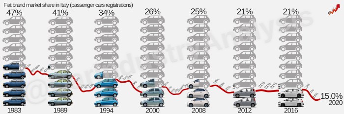 Last year, Fiat brand posted its second lowest market share in its history in Italy. According to the data for passenger cars registrations, the maker from Turin made up 15% of the volume in Italy in 2020, or 0.38 points higher than the all time low that was reached in 2019. In that year, Fiat’s market share stayed at 14.6%.