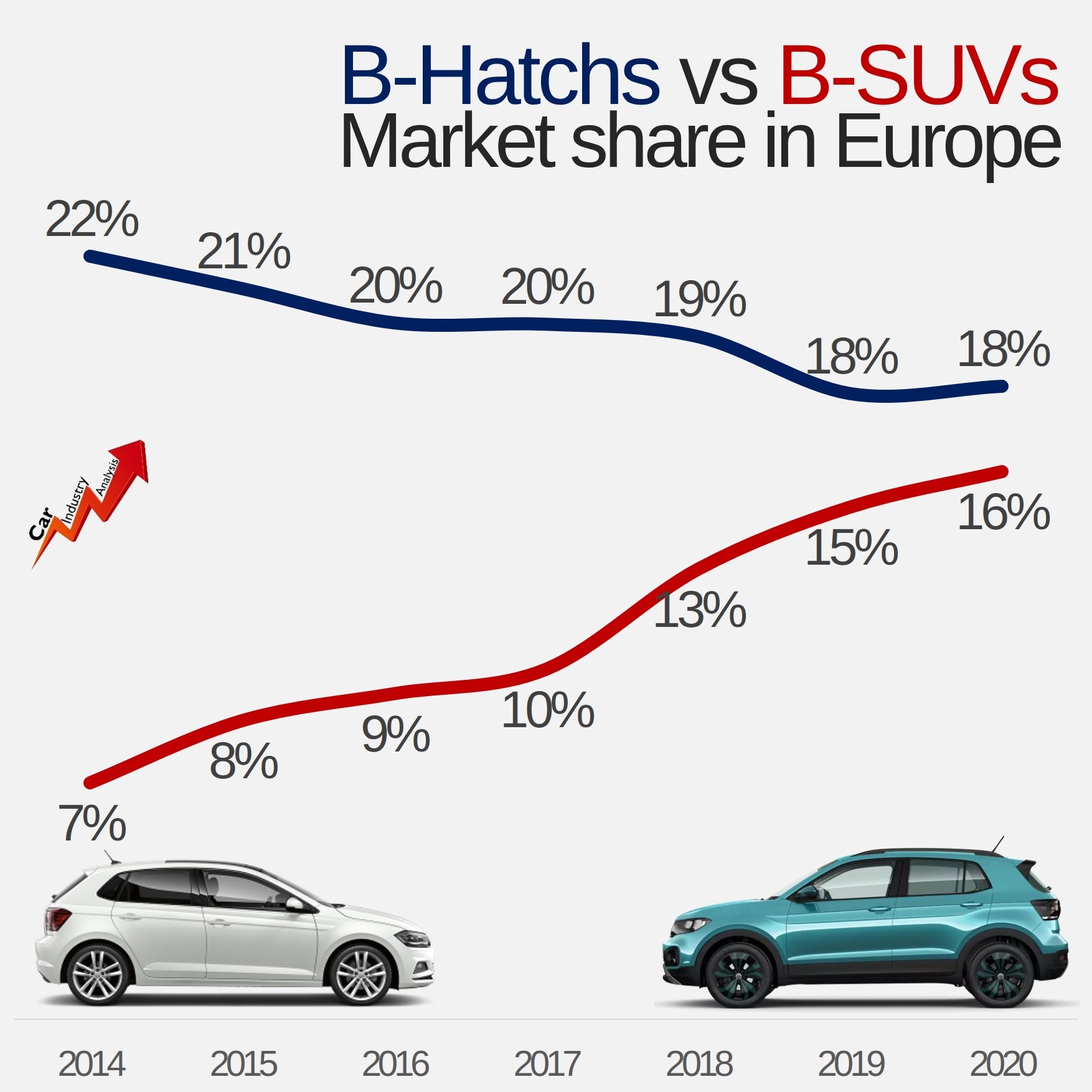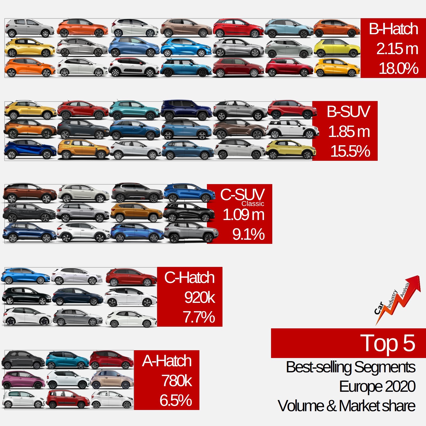 • Fiat would re-enter Europe’s biggest segment by volume. Although SUVs have been driving growth for the last 8 years, most of consumers in Europe continue to buy small hatchbacks. The B-Hatch segment, where the Punto plays, was Europe’s largest segment by volume with 2.15 million units in 2020. That’s almost 300,000 units more than B-SUV’s volume. A new Punto would allow Fiat to have access to this big quantity of potential clients.