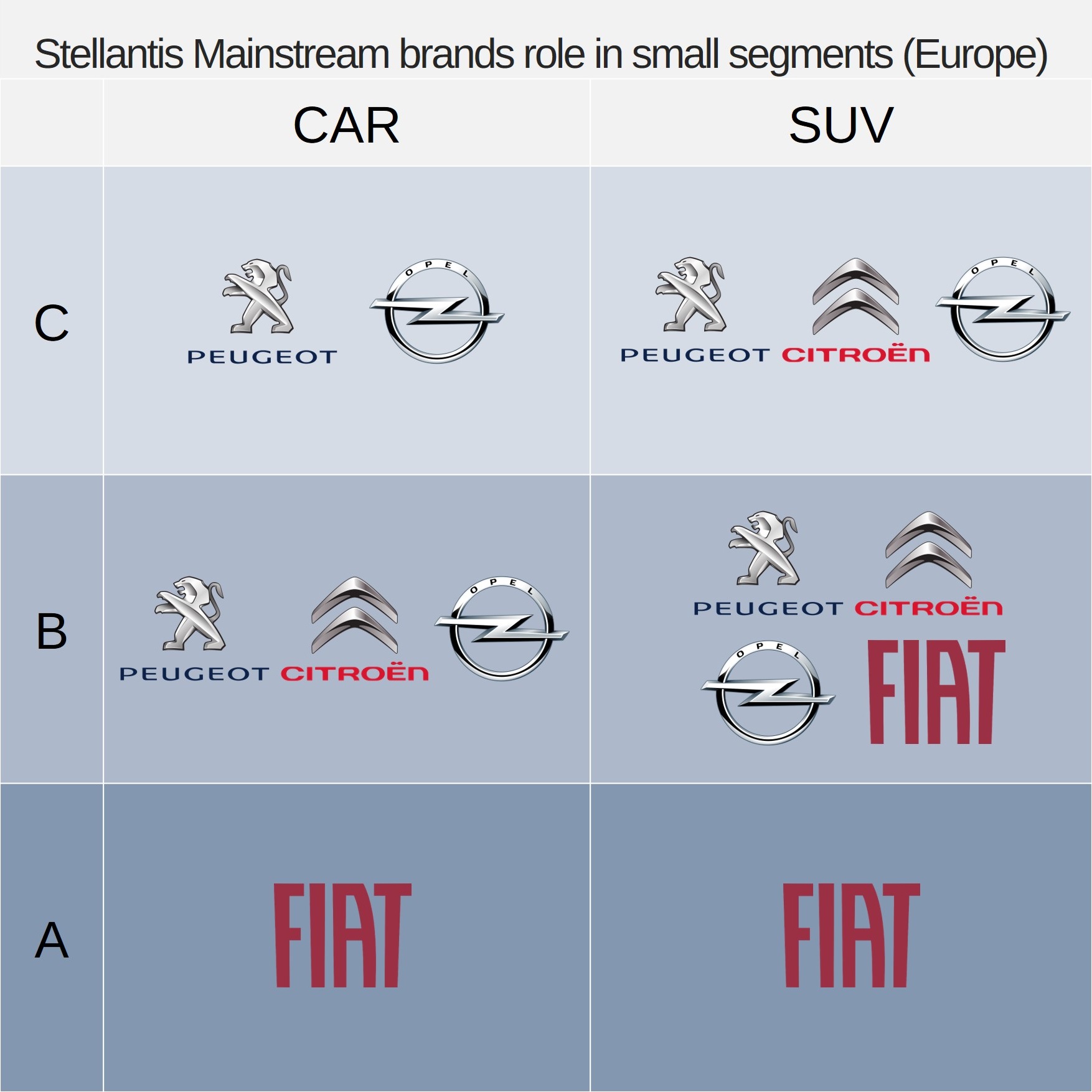 This is how I think the four mainstream brands of Stellantis in Europe should play. Fiat must attack from below with both, city-cars and A-SUVs. Peugeot, Citroen, Opel would be in charge of the B-Hatchs, and all four brands would have their own B-SUV with a different positioning. The C-Hatchs would be only covered by Peugeot and Opel; and the C-SUV would continue as it is now.