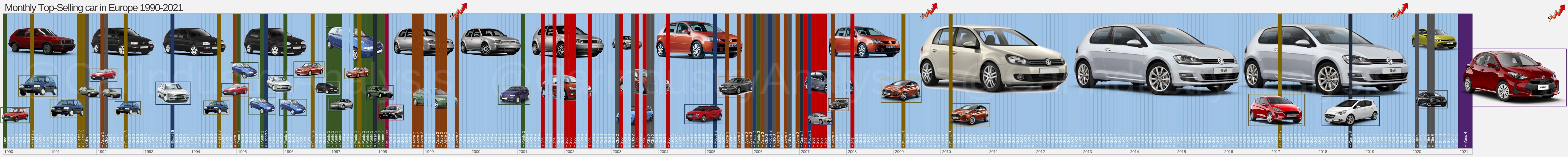 As the Toyota Yaris sets a new record by positioning as the top-selling car in Europe in January, I have decided to have a look at the historical data regarding the best-sellers in the continent. During the last 30 years, there’s no doubt that Europe is the land of the Volkswagen Golf, the absolute leader by far.