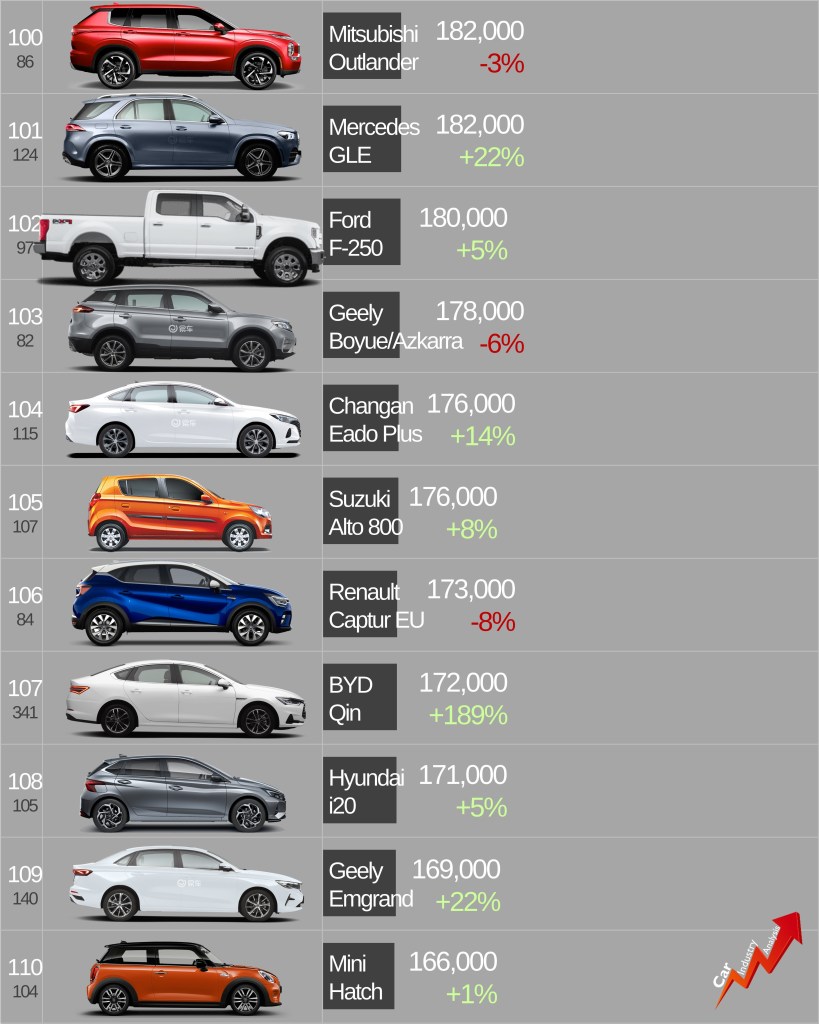 • Tesla Model 3, hits the top 10 and keeps climbing. It should hit the top 5 by the end of this year.