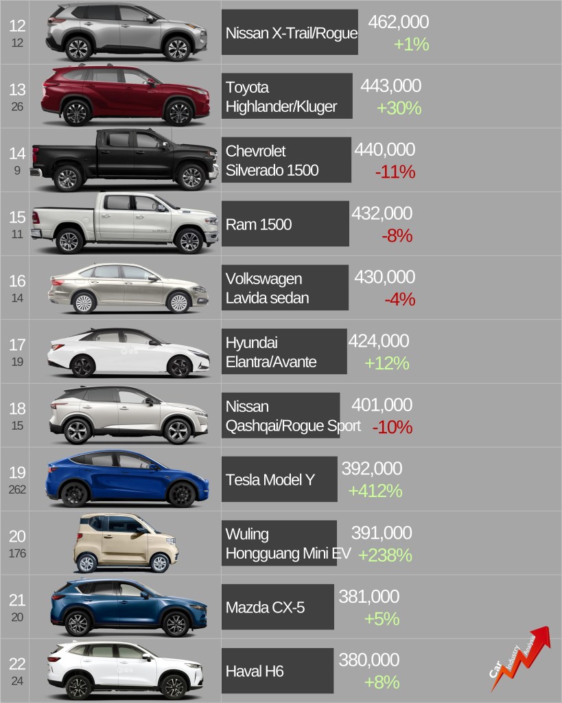 • Tesla Model Y in top 20. It is expected to outsell the Model 3 by the end of this year.