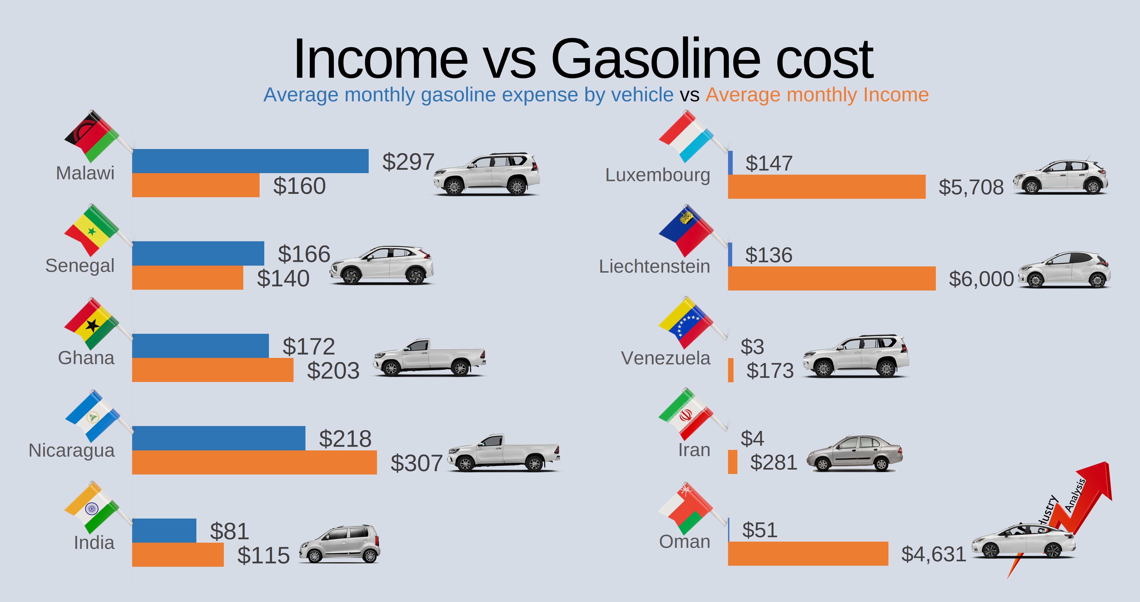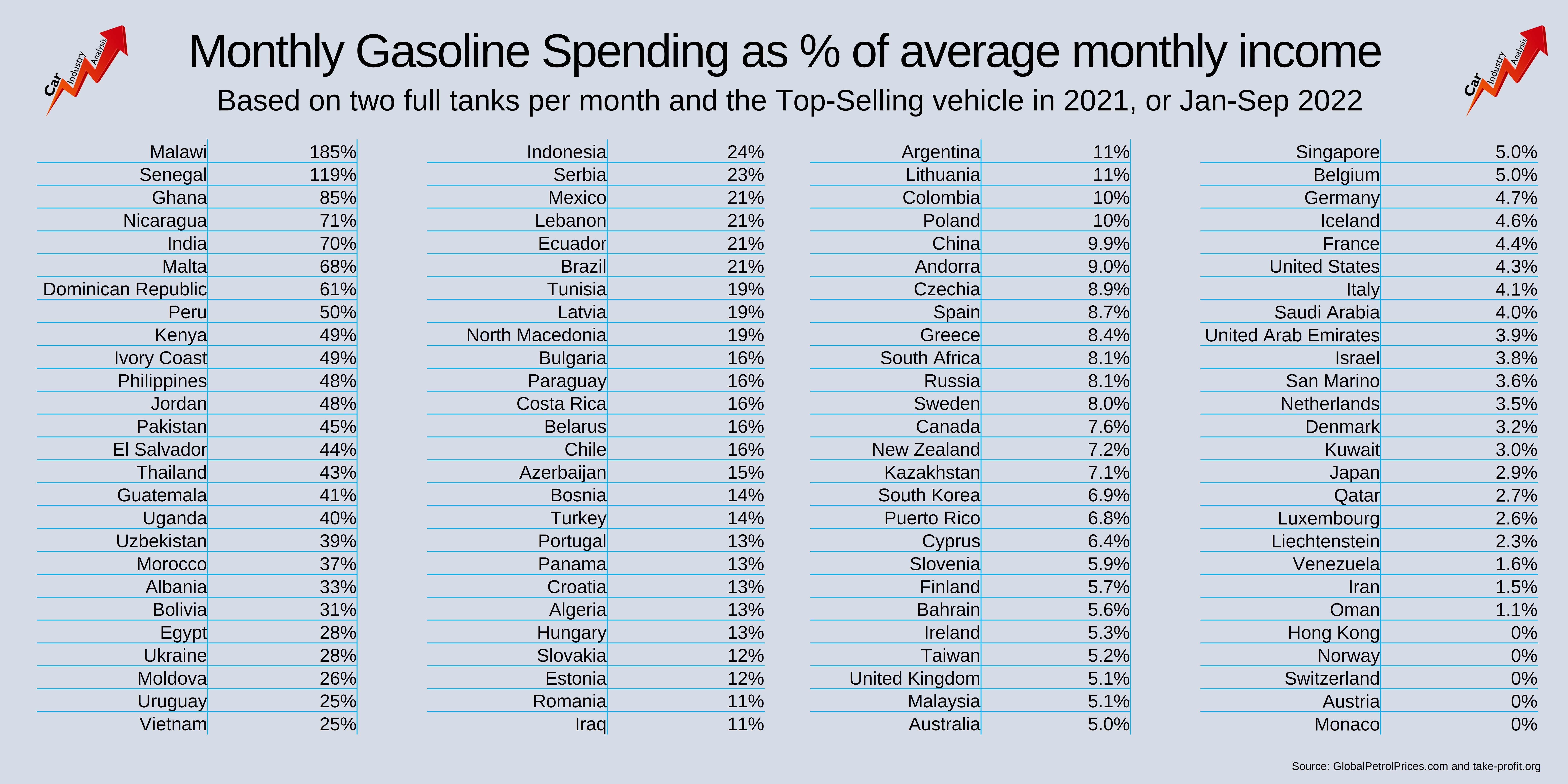 Malawi led the ranking again, as the driver of a Prado would need to pay $297 in gasoline per month, while perceiving an average income of $160. In other words, in Malawi you need almost two months of income to pay for one month of gasoline for your car.