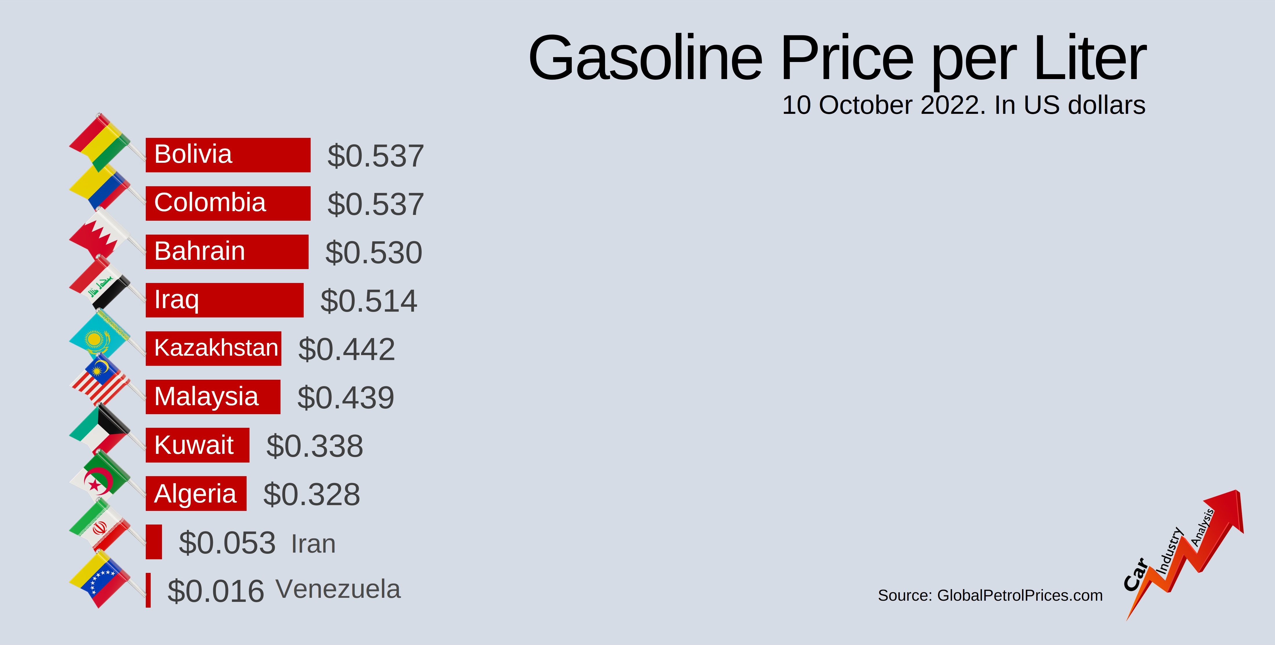 On the opposite side, the 10 countries with the lowest prices per liter are Bolivia, Colombia Bahrain, Iraq, Kazakhstan, Malaysia, Kuwait, Algeria, Iran, and Venezuela.