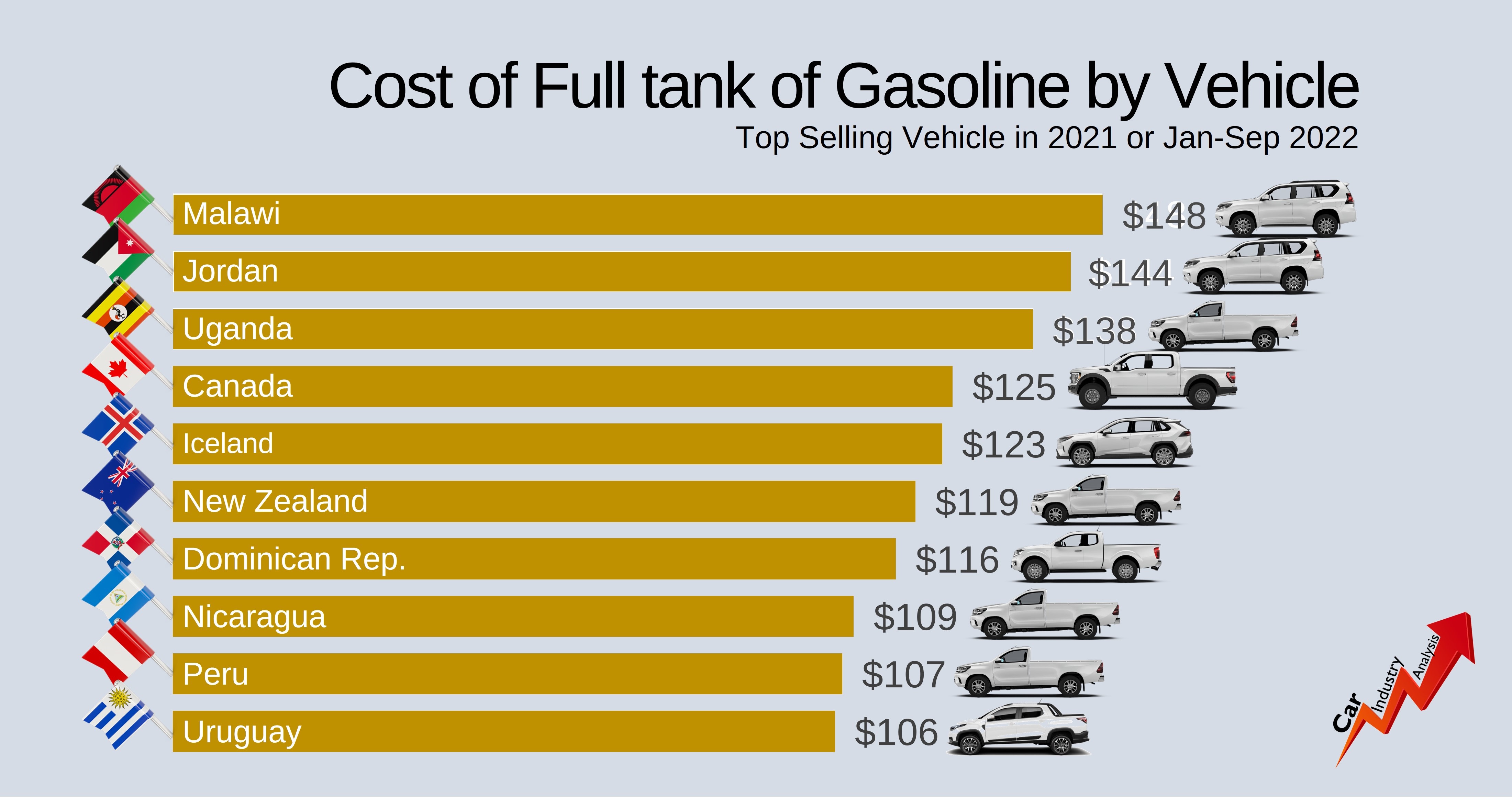 According to my research, Malawi has the dubious distinction of having the highest pump prices in the world, considering the top-selling cars. Last year, the Toyota Prado led the market of new vehicles, so a driver must pay $148 to fill up the tank of this midsize SUV.