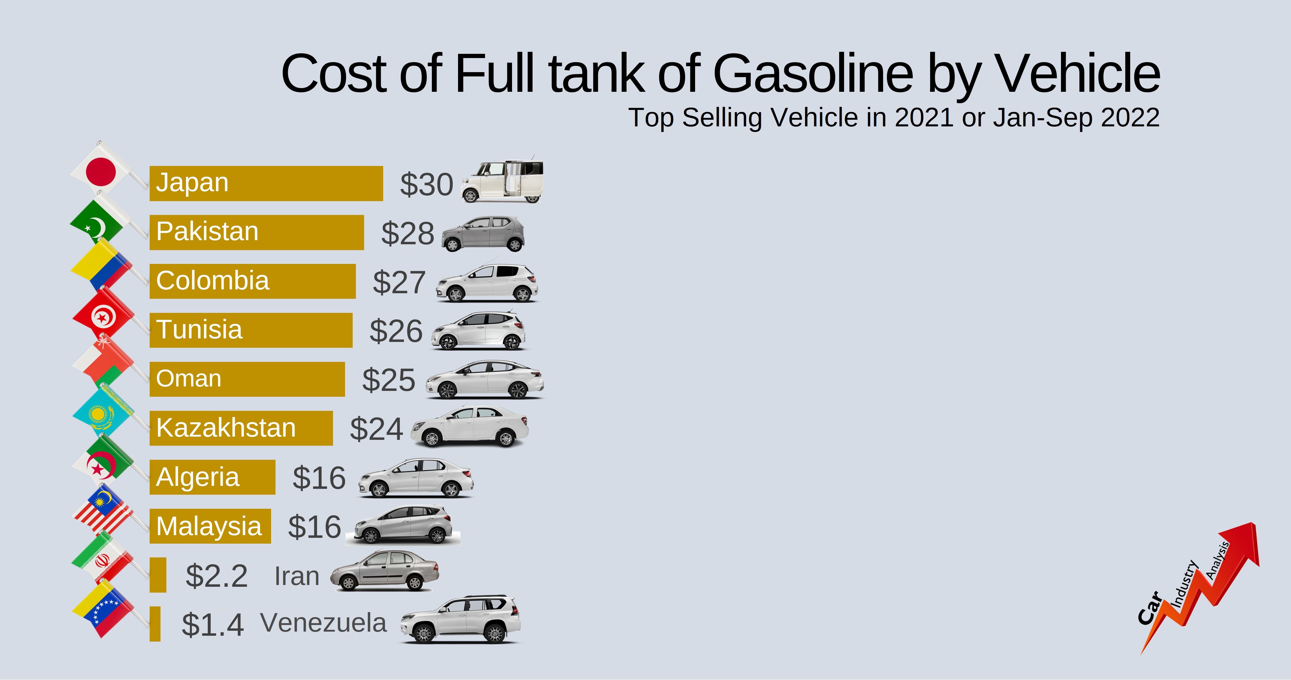 In contrast, those countries driving more frugal cars are usually in the bottom: Japan (Kei Cars), Pakistan (Suzuki cars), Colombia (Dacia made products), Tunisia, Oman, Kazakhstan, Algeria, Malaysia, Iran; there is one exception: Venezuela, where the Prado led the rankings in 2021, but still, it is very cheap to fill up.