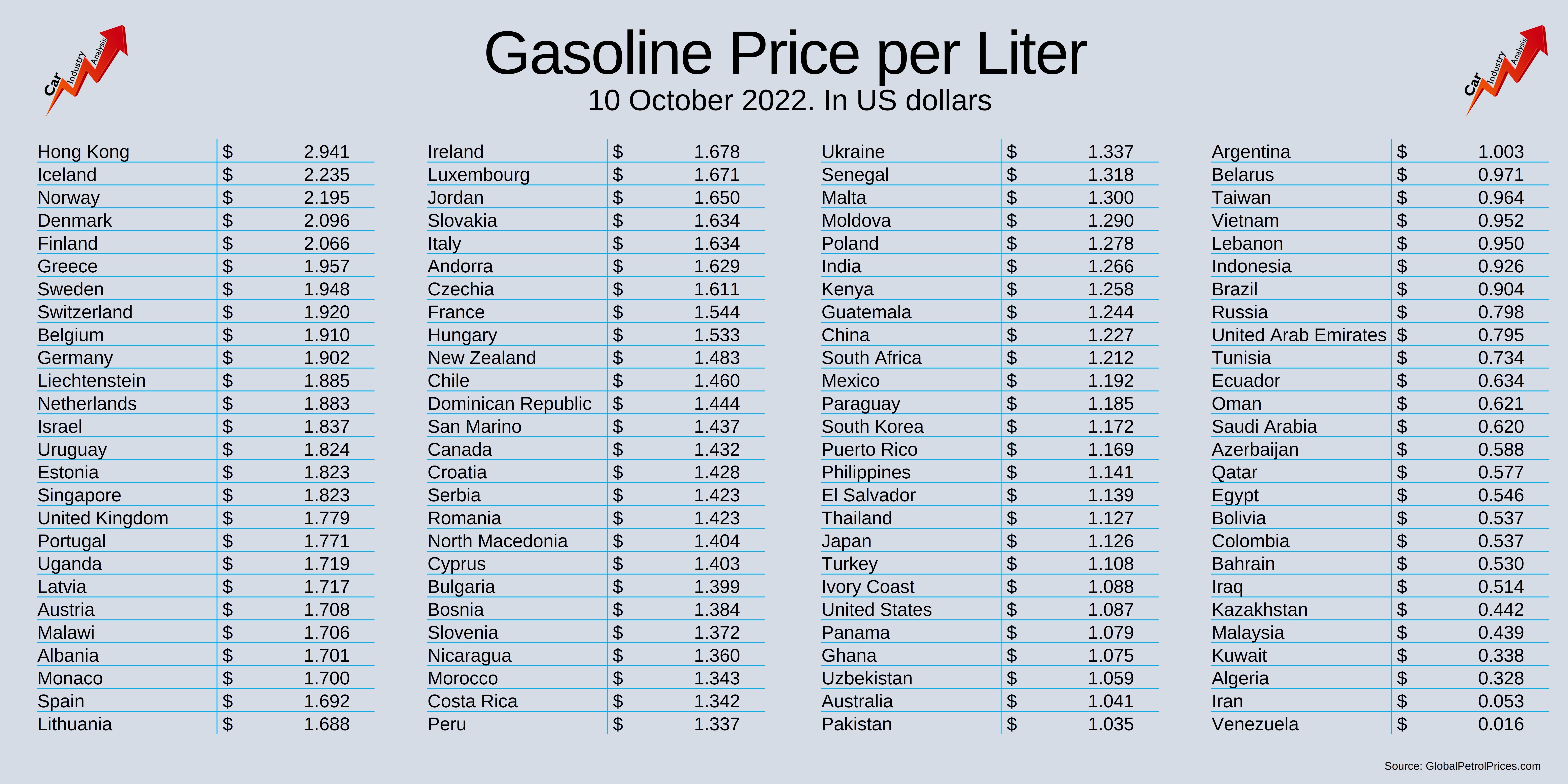 According to the weekly update produced by GlobalPetrolPrices.com, the country or territory with the highest gasoline price is Hong Kong. In this little Chinese island you need to pay $2.941 for a liter of gasoline. The surging land costs for building fuel stations, which have increased by more than 400 per cent in the past decade explains the high cost.