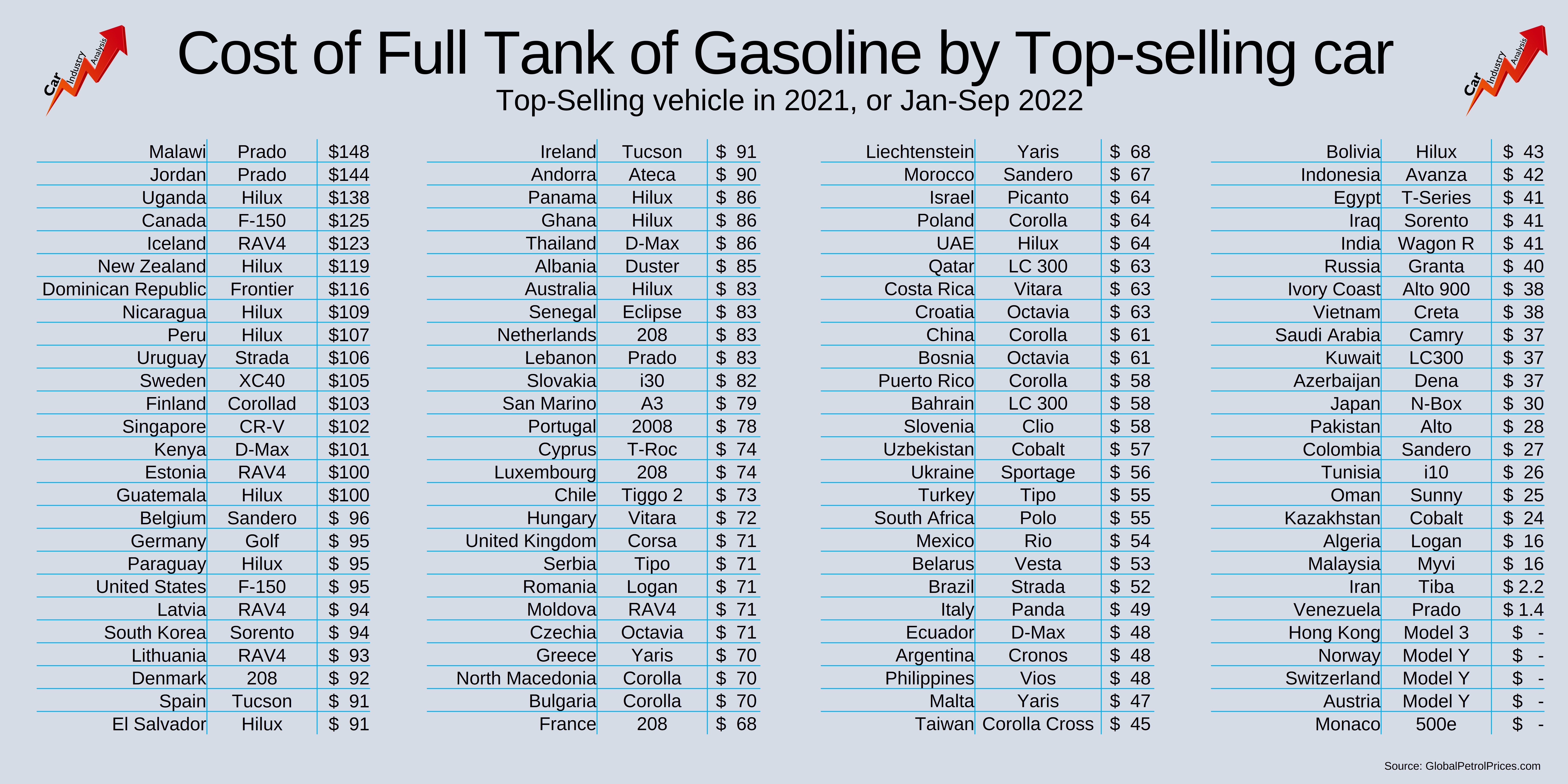 This tiny African country is followed by Jordan, where the Prado also ranked first in 2021, and whose tank needs $144 to be full. Uganda came third with $138 to fill up a Toyota Hilux, the country’s most popular vehicle.