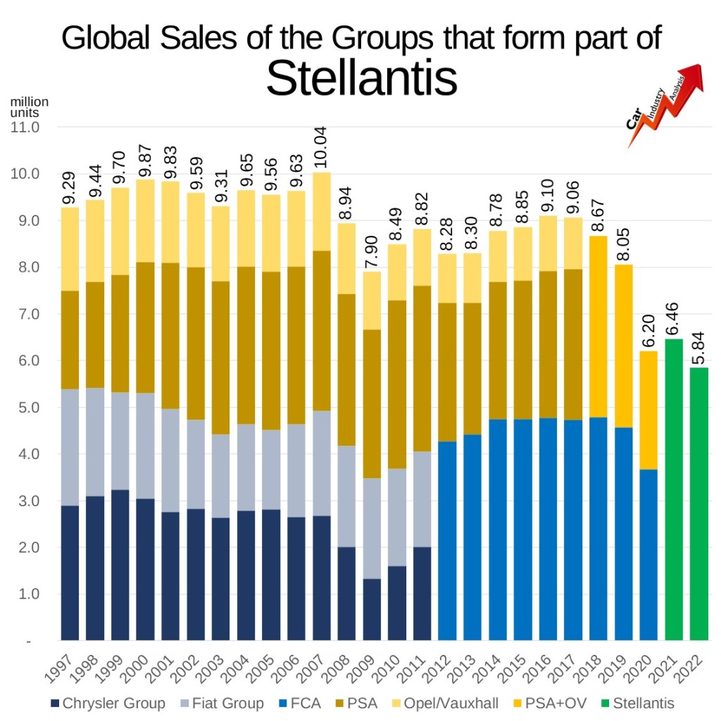 Source: Financial Statements, Annual reports from Fiat Spa, Fiat Group, FCA, PSA, and Stellantis. Volume estimates for Opel/Vauxhall in 1997-2005, 2011-2012; for Fiat Group 1997-2001, 2004.