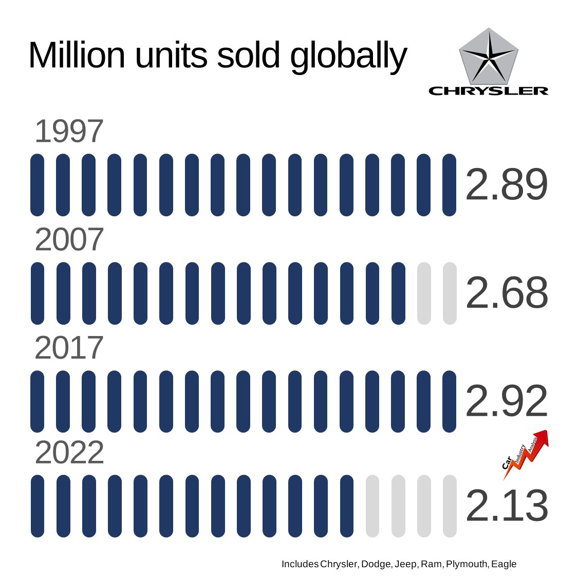 Although Stellantis was created in 2021 so the the both group’s operations started to be combined since that year, we can have a look at the separate results for the four companies that today make part of the group. Fiat Group (Fiat, Abarth, Alfa Romeo, Lancia, Maserati), Chrysler Group (Chrysler, Jeep, Ram, Dodge), PSA (Peugeot, Citroen), and Opel/Vauxhall (which made part of GM until August 2017).
