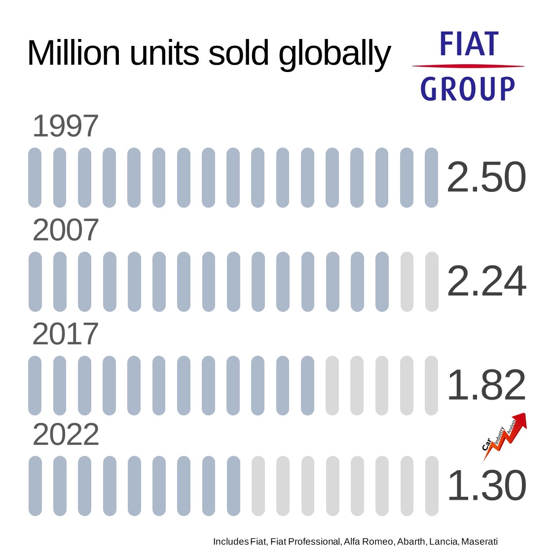 Source: Financial Statements, Annual reports from Fiat Spa, Fiat Group, FCA, PSA, and Stellantis. Volume estimates for Opel/Vauxhall in 1997-2005, 2011-2012; for Fiat Group 1997-2001, 2004.