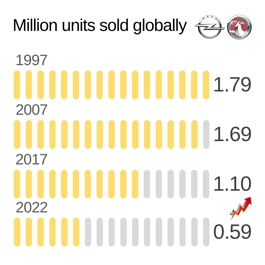 Stellantis posted mixed results in 2022. From one side, it was able to increase its operating margin by 1.2 percentage points between 2021 and 2022, and become one of the world’s most profitable car makers. On the other hand, it continued to sell fewer cars, not only compared to 2021, when the merger took place, but also compared to the previous years. According to my research, the combined units sales of former FCA (including former Fiat Group and Chrysler Group), former PSA, and GM’s Opel/Vauxhall, saw their lowest level at least since 1996.