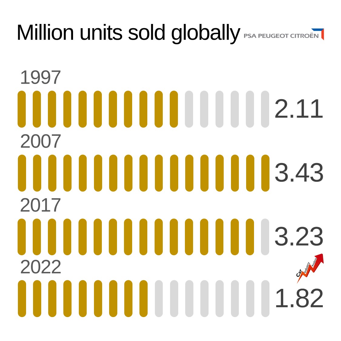 The situation is even worse compared to 2002, 20 years ago. The volume that year totaled 9.59 million units, with PSA still losing the most, down by 1.45 million units. Opel/Vauxhall lost almost 1 million units, followed by Chrysler (-692,000) and Fiat Group (-612,000).