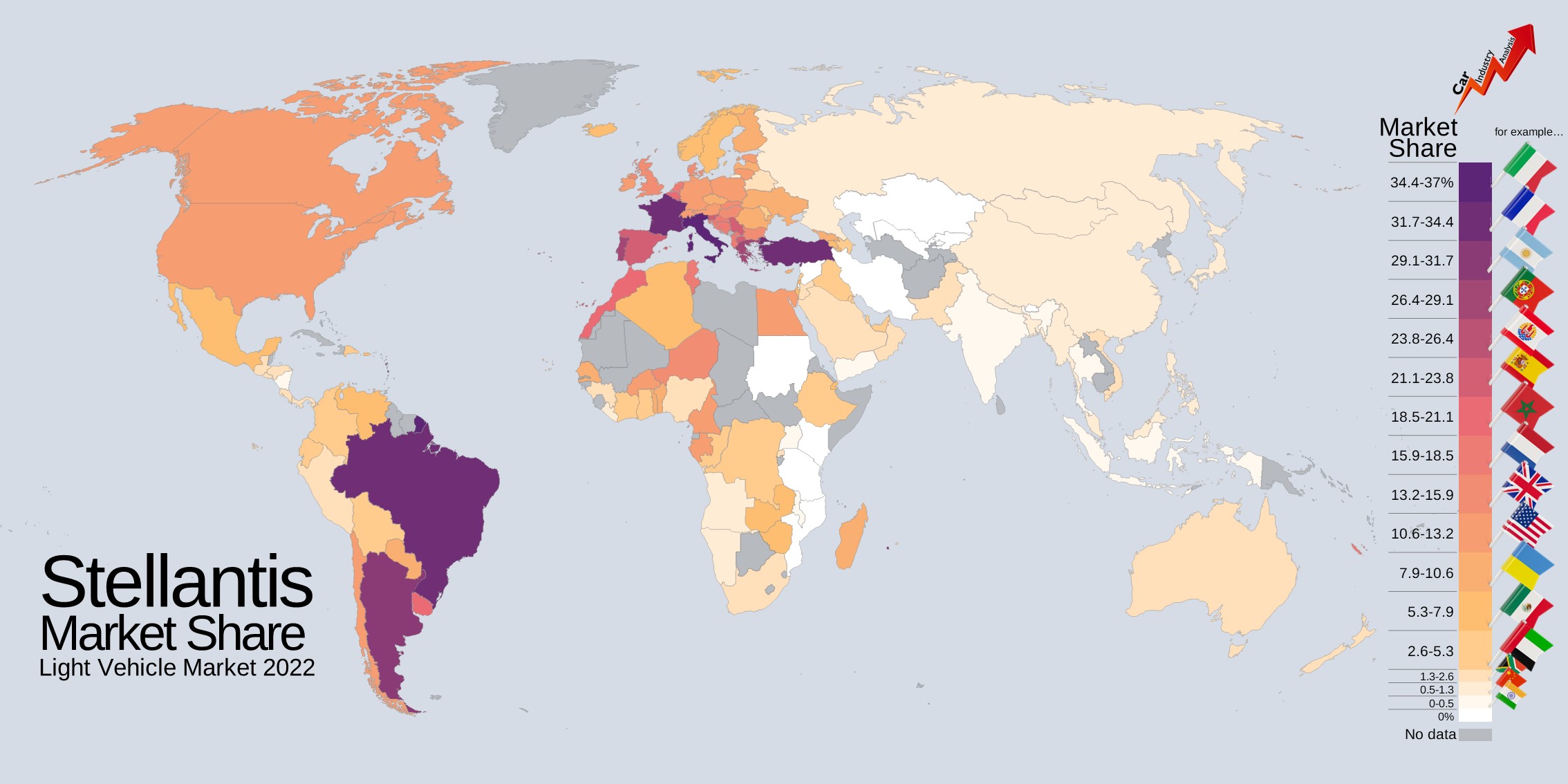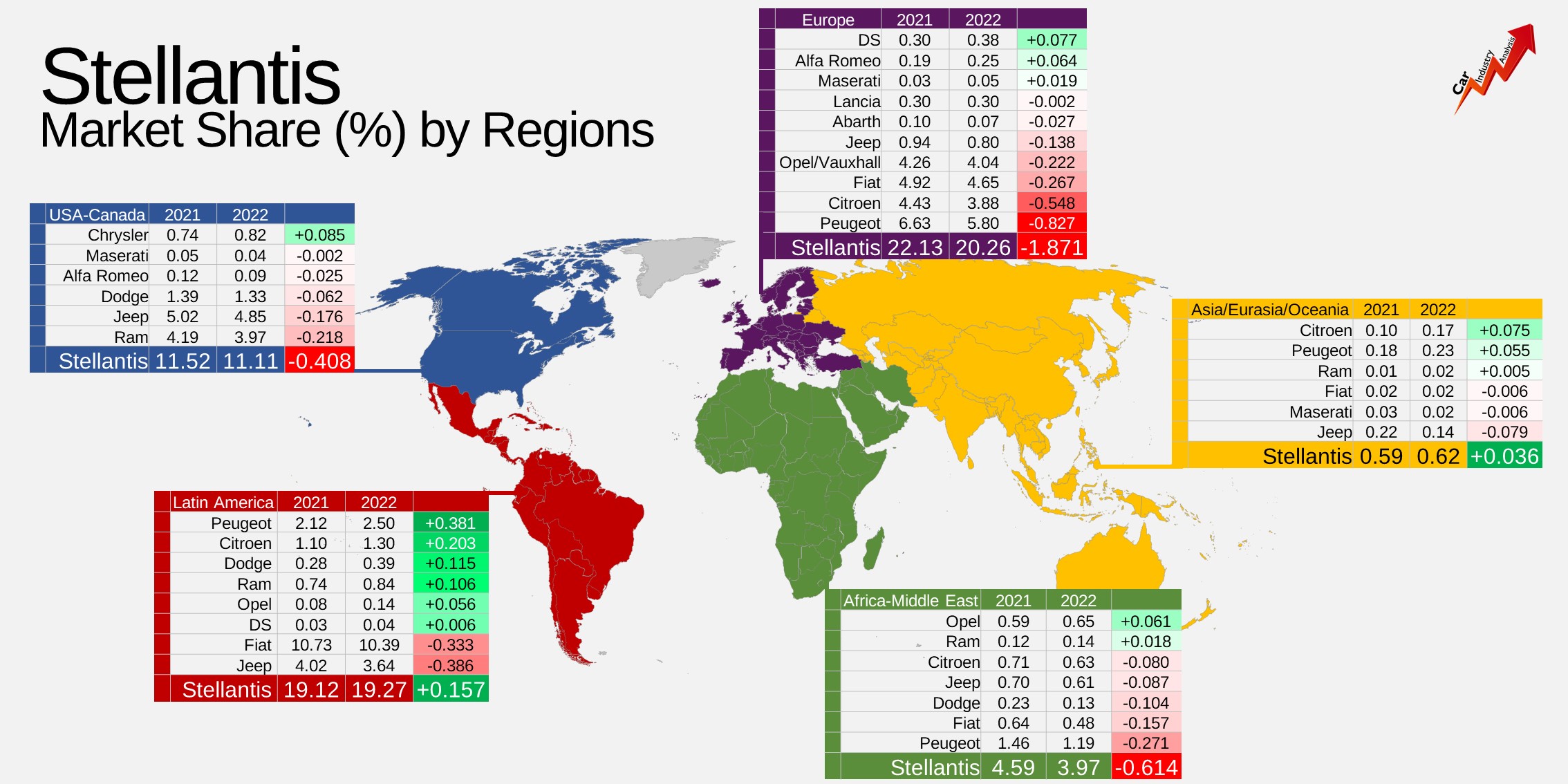 The group sold 5.84 million vehicles in 2022, down by 9.4% compared to the previous year. Stellantis was the world’s fourth largest behind Toyota, Volkswagen, and Hyundai-Kia, and ahead of General Motors, Honda, and Ford. As global light vehicle sales fell by 2%, Stellantis lost market share from 8.00% in 2021 to 7.36% last year. The drop put this group among the big losers of the year, only behind Nissan, Volkswagen and Honda groups, which lost more market share.